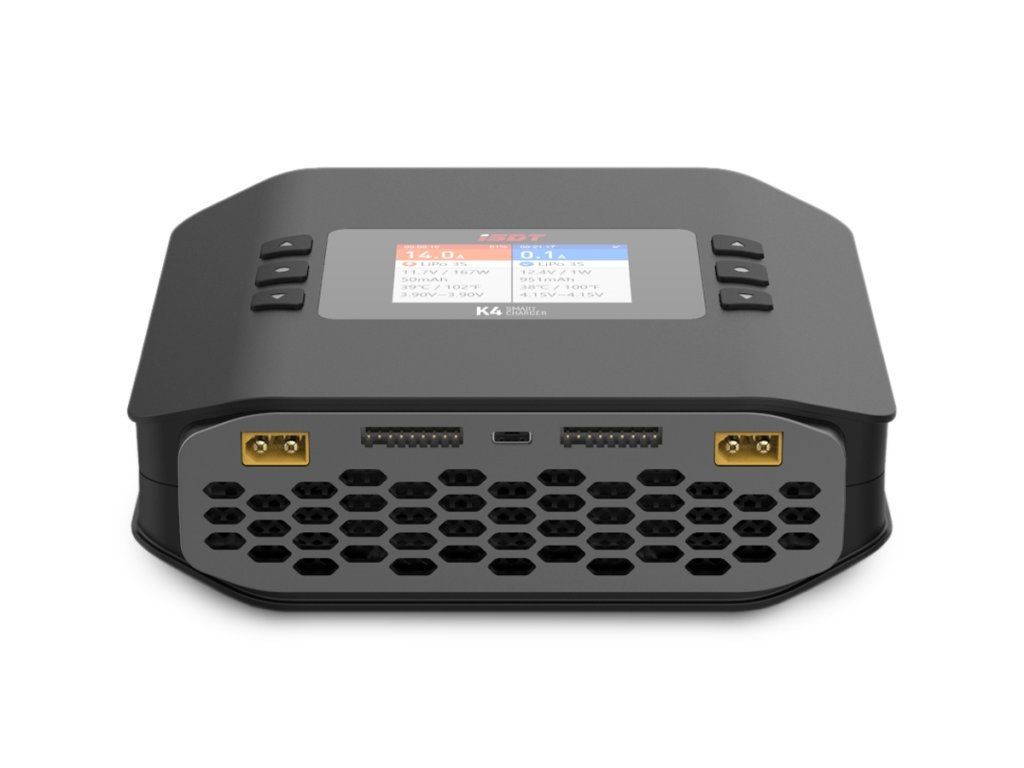 Vysokovýkonný dvoukanálový nabíječ ISDT K4 2x600W je inteligentní nabíječ s napájením ze sítě i autobaterie a velmi jednoduchou a přehlednou obsluhou. K4 umožňuje nabíjet a vybíjet běžné typy článků (NiCd, NiMH, LiPo, LiHV, ULiHV, Li-ion, LiFe, Pb), navíc je vybaven vestavěnými osmikanálovými balancery, které zajišťují bezpečné nabíjení lithiových akumulátorů. Nabíječ je vybaven barevným LCD displejem a programovacími tlačítky, které vám poskytnou možnost komfortního a velice přehledného nastavování parametrů, řízení a sledování průběhu nabíjení/vybíjení.