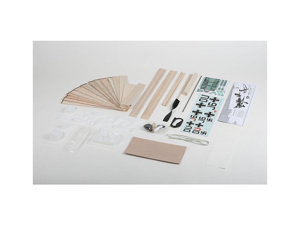 Stavebnice obsahuje: balsové předseknuté díly, balsové nosníky, předseknuté díly z plastikové překližky, vakuově lisované maketové díly (kryt motoru, motor...), čirý acetátový výlisek krytu kabiny, plastovou vrtuli s hřídelí a hlavicí, gumový svazek (guma 5x1mm), ocelovou strunu na podvozek a další drobné díly, plastová kola, potahový papír, rukojeť a vahadlo pro upoutaný model, velký aršík mokrých obtisků, stavební plán.
