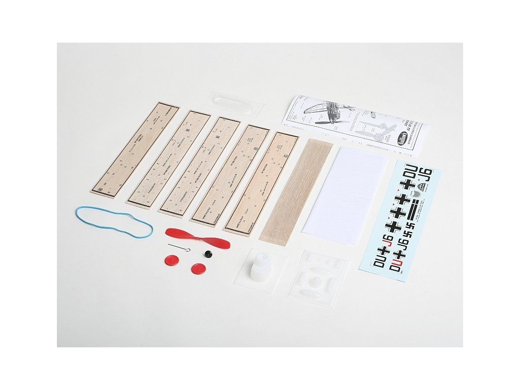Stavebnice obsahuje: balsové předseknuté díly, balsové nosníky, vakuově lisované díly (kryt motoru, kryt kabiny...), plastovou vrtuli s hřídelí a hlavicí, gumový svazek, kola, ocelovou strunu na podvozek a další drobné díly, potahový papír, aršík mokrých obtisků, stavební plán.