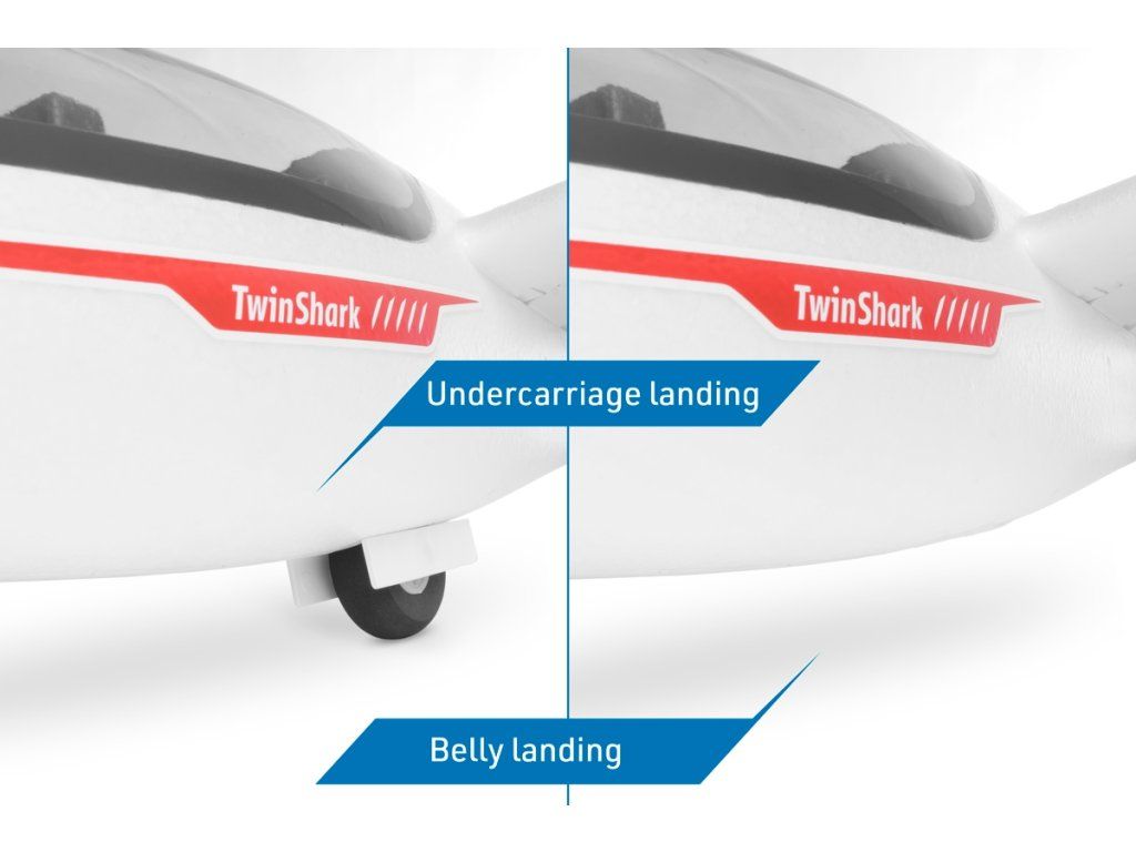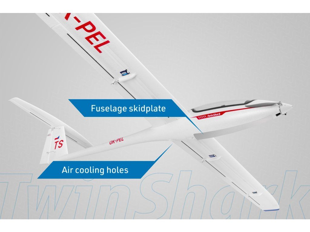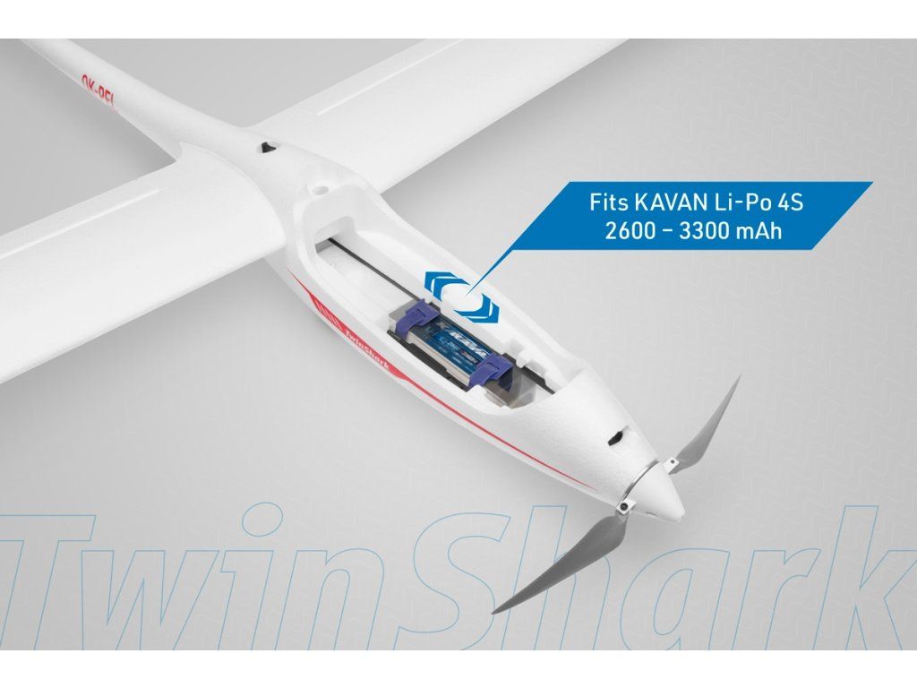 Pro napájení budete potřebovat LiPo čtyřčlánek s kapacitou 2600–3300 mAh se zatížitelností aspoň 30C. Konkrétní typ volte tak, aby vám bez dalšího dovažování co nejlépe vycházela správná poloha těžiště.Pro ovládání modelu v nouzi vystačíte i se šestikanálovou počítačovou RC soupravou bez speciálních funkcí – v základním provedení jsou křidélka a klapky zapojeny pomocí Y-kabelů vždy jen do jednoho kanálu. Ideální je samozřejmě použití aspoň sedmikanálové počítačové RC soupravy umožňující nezávislé ovládání křidélek a klapek dvěma servy a jejich mixování v roli butterfly brzdy (obě křidélka se vychylují souhlasně nahoru a obě klapky dolů), což dnes umí i cenově dostupný Radiolink AT9S nebo AT10II nebo Futaba T6K či T10J. V takovém případě je nutno nahradit Y-kabely křidélek a klapek v trupu čtyřmi jednotlivými (15–30 cm) prodlužovacími kabely. V návodu samozřejmě nechybí důkladná tabulka s prověřeným výchozím nastavením výchylek kormidel (včetně mixů), abyste Twin Sharka snadno připravili k letu, i když to třeba bude váš první větroň s „plnou mechanizací“ křídla.