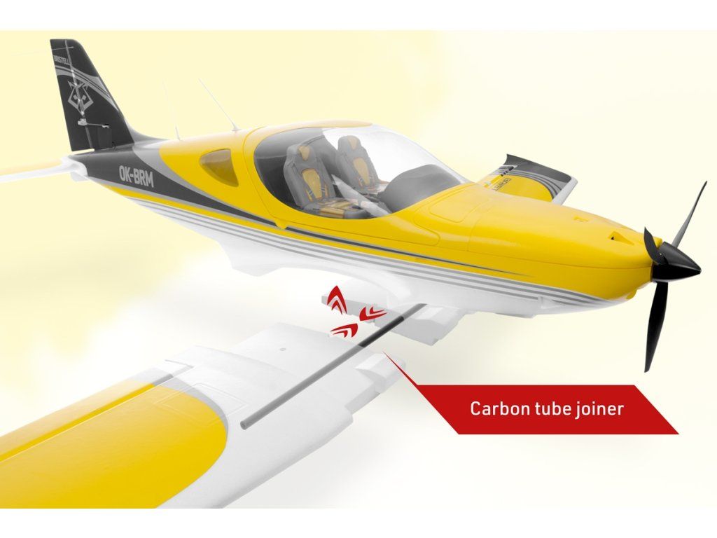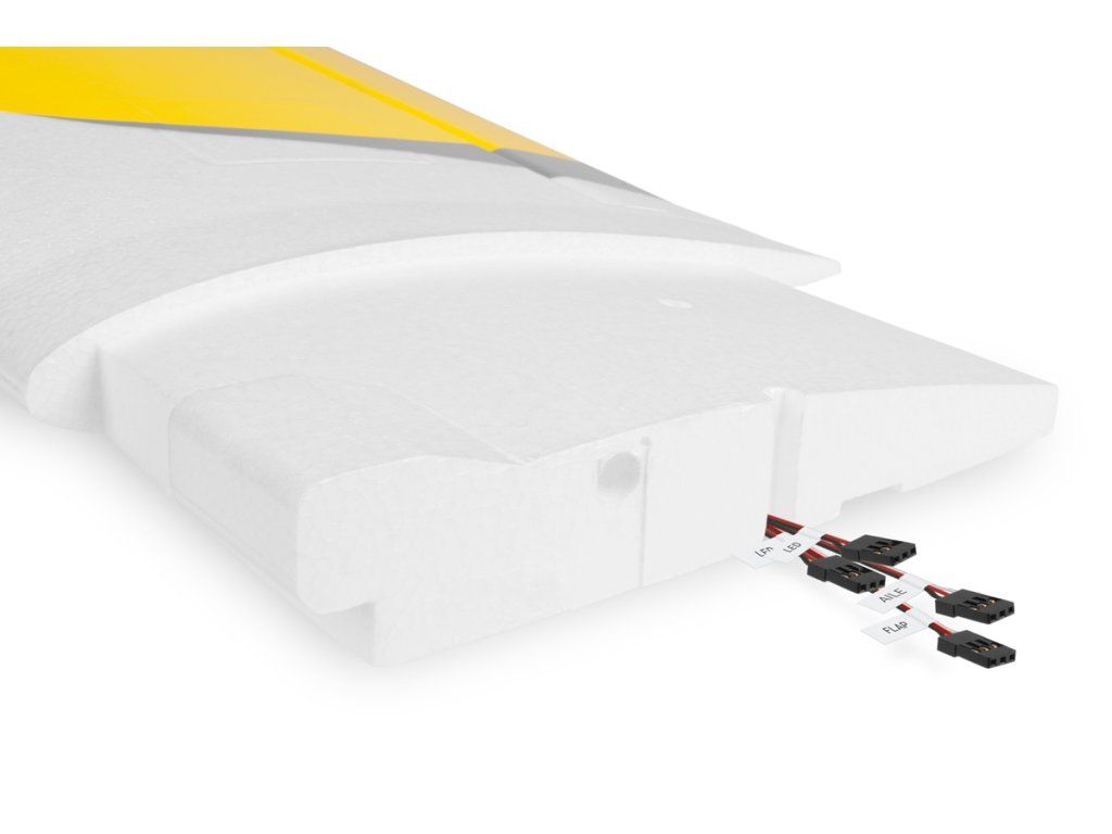 Křídlo modelu z pěnového EPO je dvojdílné s uhlíkovými nosníky a uhlíkovou trubkovou spojkou. Na místě je zajištěnu šrouby. Křidélka i klapky jsou ovládány nezávisle vždy dvěma servy s krátkými přímými drátovými táhly a nechybí ani funkční poziční a přistávací LED světla.