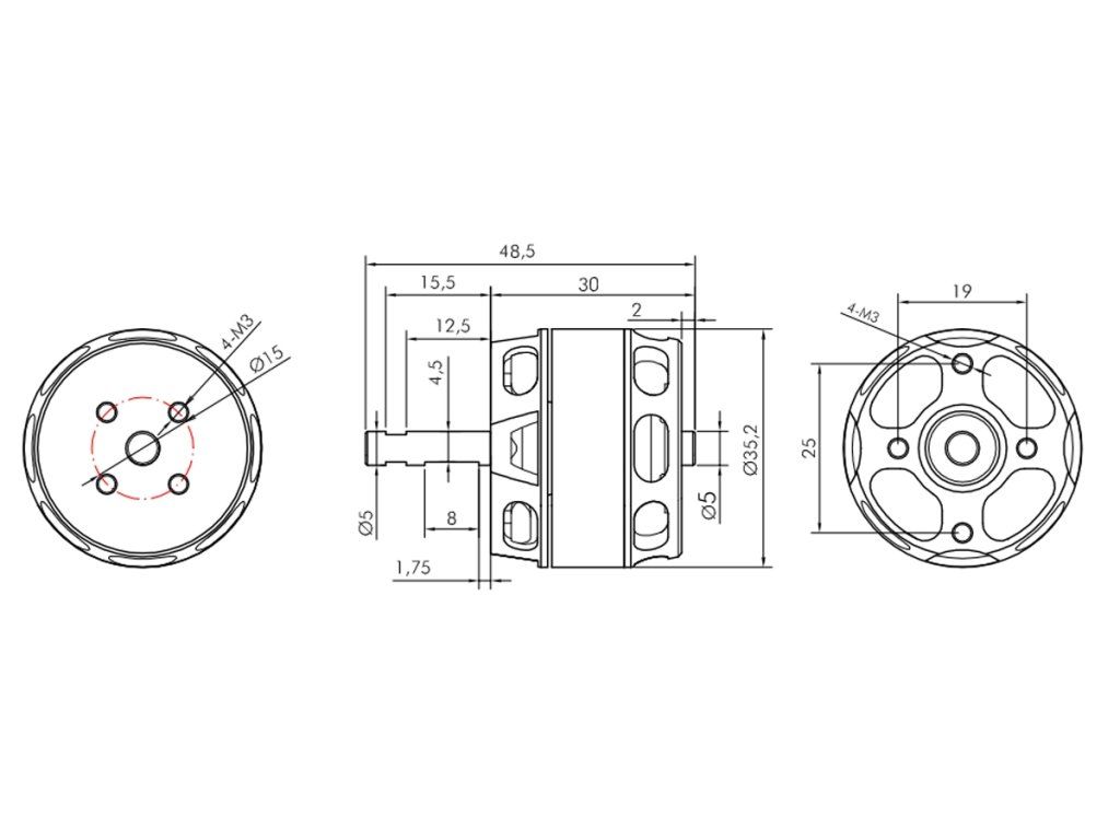 Montáž motoru: KAVAN PRO 3530-1500 je konstruován pro přední i zadní montáž. Při přední montáži za čelo motoru použijte nejméně dva (protilehlé), nebo čtyři šrouby M3, které zasahují do čela motoru v rozmezí 3,5-4 mm. Motorová přepážka by měla být z 3 mm letecké překližky. Sada pro zadní montáž (upevňovací kříž, unašeč vrtule pro zadní montáž) je dodávána spolu s motorem.
