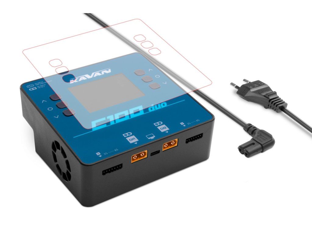 Malý dvoukanálový nabíječ KAVAN C100 Duo 2x500W byl konstruován se snahou nabídnout inteligentní nabíječ s vysokým výkonem s napájením ze sítě i autobaterie a velmi jednoduchou a přehlednou obsluhou. C100 Duo umožňuje nabíjet a vybíjet běžné typy článků (NiCd, NiMH, LiPo, LiHV, ULiHV, Li-ion, LiFe, Pb), navíc je vybaven vestavěnými šestikanálovými balancery, které zajišťují bezpečné nabíjení lithiových akumulátorů. Nabíječ je vybaven barevným LCD displejem a programovacími tlačítky, které vám poskytnou možnost komfortního a velice přehledného nastavování parametrů, řízení a sledování průběhu nabíjení/vybíjení. Mezi volitelnými jazyky menu samozřejmě nechybí ani čeština.