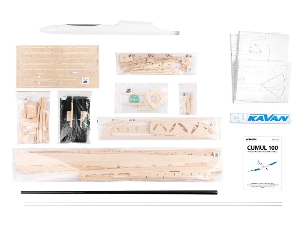 Stavebnice vysokovýkonného termického větroně klasické velmi lehké celobalsové konstrukce v rozsypu, který můžete také snadno upravit pro pohon střídavým elektromotorem třídy KAVAN C2836/AXI 2217. CUMUL 100 je ideálním projektem pro modeláře, který si chce postavit opravdu výkonný model pro rekreační i soutěžní létání. Díky promyšlené konstrukci s CNC vyřezávanými díly opatřenými výstupky a zářezy, které do sebe zapadají jako díly puzzle skládačky, jde stavba velmi rychle a snadno. S Cumulem 100 se neztratíte v soutěžích kategorie F5J nebo v různých „enduro“ třídách. Stavebnice obsahuje díly trupu pro čistý větroň i elektrolet. Stavba jde hezky rychle a není jí příliš mnoho – CUMUL 100 je pořád relativně jednoduchý model, ale není určen pro začátečníky.