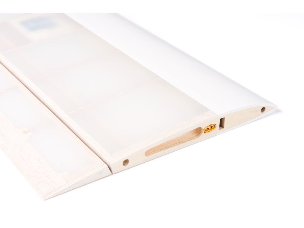 Trojdílné křídlo s profilem AG 40-42 je klasické konstrukce s balsovými žebry a tuhým potahem torzní skříně. Hlavní nosník je tvořen pásnicemi ze smrkových lišt s balsovou stojinou, což zaručuje vysokou pevnost kostry při velmi nízké hmotnosti. Uši s elegantními winglety se k centroplánu připojují uhlíkovými spojkami a duralovými vymezovacími kolíky. Klapky a křidélka jsou ovládány nezávisle čtyřmi servy pomocí krátkých drátových táhel. K trupu se křídlo upevňuje dvěma plastovými šrouby.