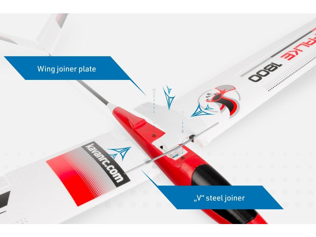 Křídlo modelu z pěnového EPO je dvojdílné s uhlíkovým nosníkem a s ocelovou drátovou spojkou; k trupu se upevňuje dvěma plastovými šrouby. Křidélka jsou ovládána nezávisle dvěma servy s krátkými přímými drátovými táhly.