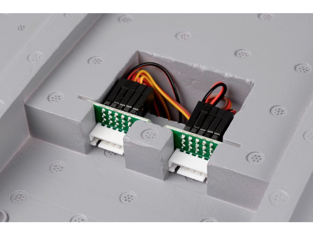 Pro ovládání modelu vystačíte i jen se šestikanálovou počítačovou RC soupravou bez speciálních funkcí – v základním provedení jsou křidélka, klapky, výškovka, směrovka a servo příďové nohy zapojeny pomocí zapojovací desky nainstalované v prostoru kabiny vždy jen do jednoho kanálu. Deska také zajišťuje napájení LED světel; připojený sekvencer má na starosti ovládání zatahovacího podvozku. V návodu samozřejmě nechybí důkladná tabulka s prověřeným výchozím nastavením výchylek kormidel, abyste L-39 snadno připravili k letu.
