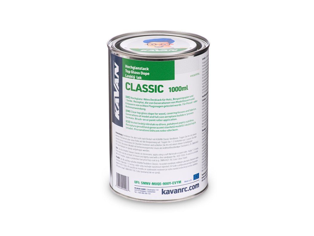 Použití: Lak dle potřeby nařeďte KAVAN Ředidlem Classic; na potah nebo dřevěné díly nanášejte měkkým plochým štetcem nebo válečkem. Naneste 1-3 vrstvy; nátěr vždy nechejte vyschnout nejméně 24 hodin a přebruste jemným brusným papírem 600-1000. Při použití na modelu se spalovacím motorem je nutno nanést vrchní krycí vrstvu odolnou vůči palivu (např. 5MA4401 RC Color bezbarvý lak ve spreji).