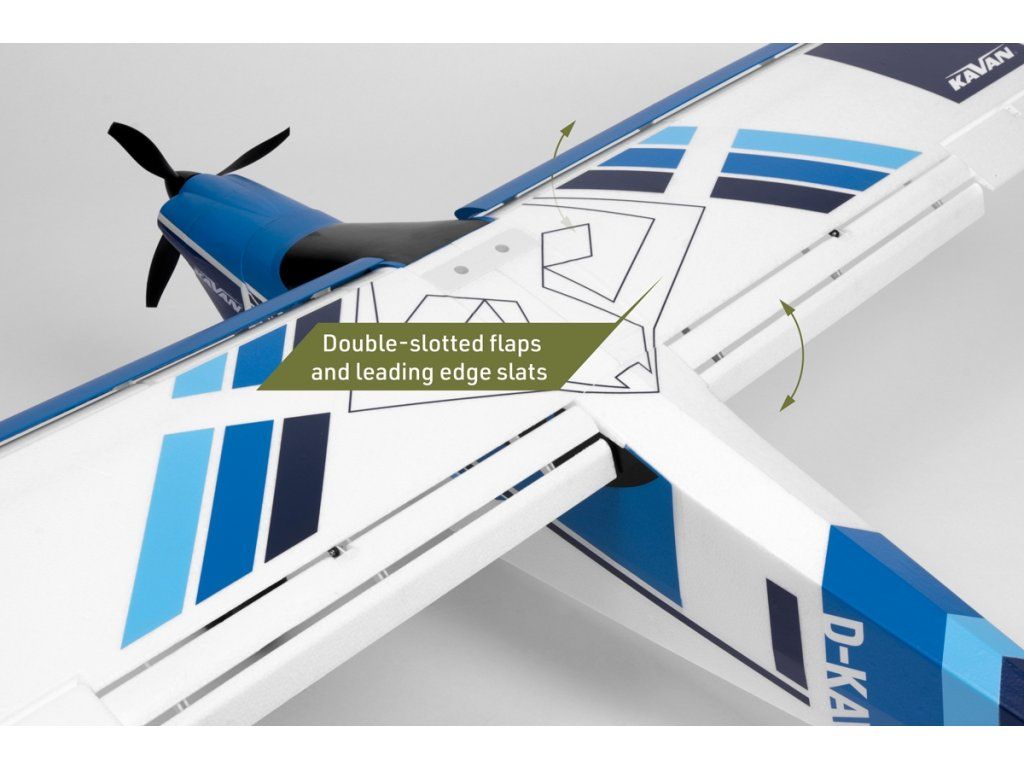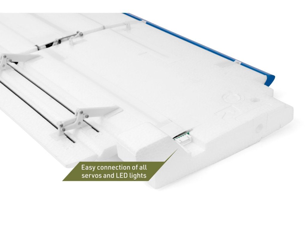 Křídlo modelu z pěnového EPO je dvojdílné s uhlíkovými nosníky a uhlíkovou trubkovou spojkou. Na místě je zajištěno šrouby. Křidélka i dvouštěrbinové Fowlerovy klapky (se spřaženými sloty na náběžné hraně) jsou ovládány nezávisle vždy dvěma servy s krátkými přímými drátovými táhly a nechybí ani funkční poziční LED světla. Snadno demontovatelné uhlíkové vzpěry křídla jsou zajištěny na místě páry drátových sponek.