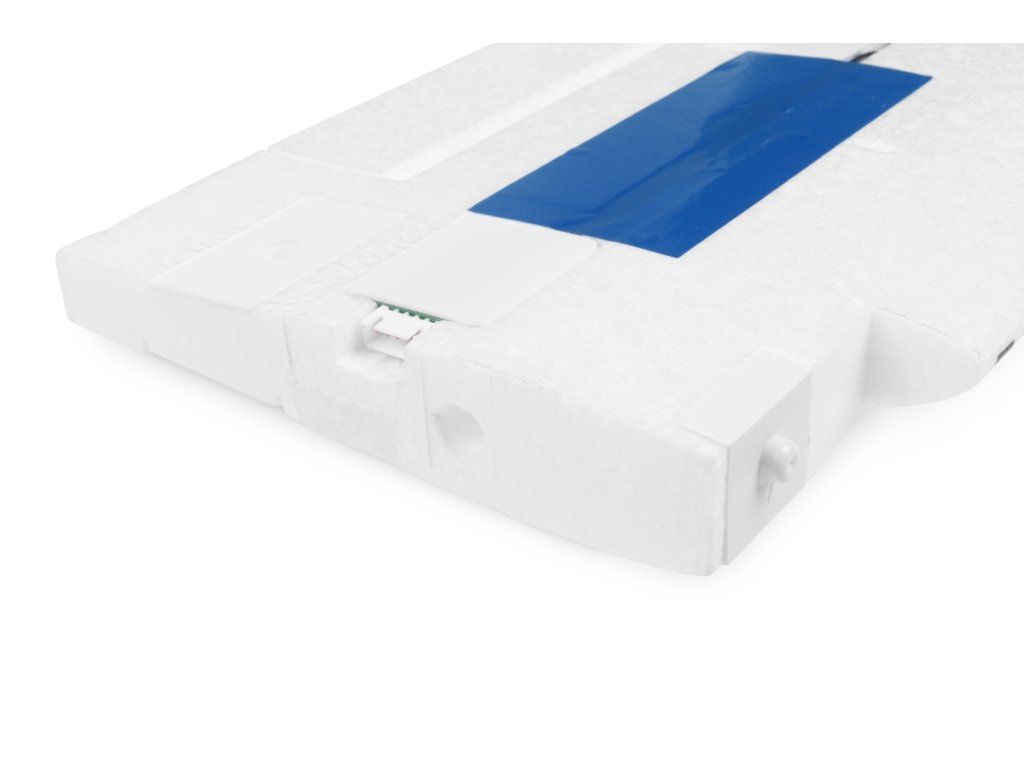 Křídlo modelu z pěnového EPO je dvojdílné s uhlíkovými nosníky a uhlíkovou trubkovou spojkou. Na místě je zajištěno šrouby. Křidélka i klapky jsou ovládány nezávisle vždy dvěma servy s krátkými přímými drátovými táhly a nechybí ani funkční poziční a přistávací LED světla. Snadno demontovatelné uhlíkové vzpěry křídla jsou zajištěny na místě páry drátových sponek.