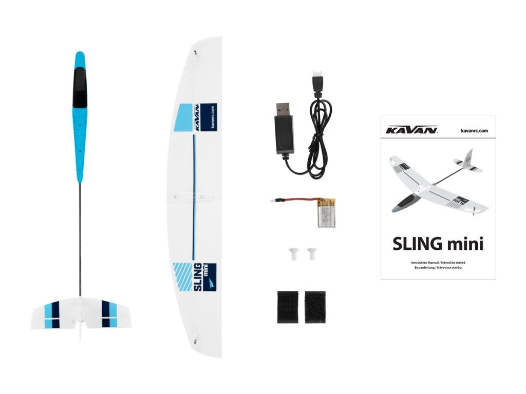 ARF set obsahuje: hotový model SLING Mini, přijímačový LiPo akumulátor, USB nabíječ a návod.