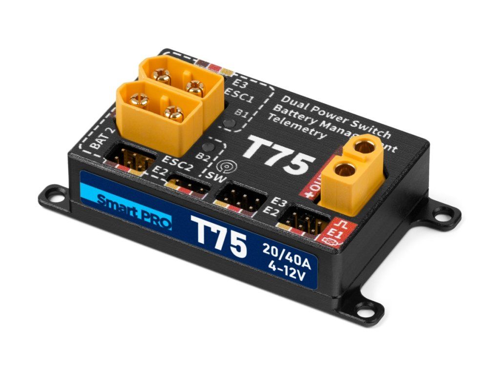 T75 představuje výkonný digitální systém pro zálohu napájení s napětím 5–8.4 V a trvalým proudem až 20 A, jenž nabízí i pokročilé telemetrické funkce. Obsahuje nabíjecí obvod a funkci dotykového vypínače. Zařízení je ideální pro středně velké modely, kde se používají např. HV serva napřímo bez stabilizace napětí.