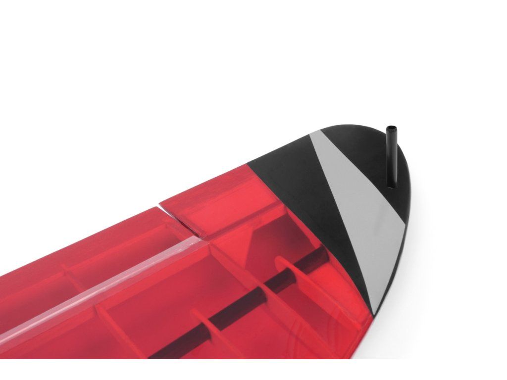 Ocasní plochy jsou deskové, lepené z CNC vyřezávaných balsových dílů. Kormidla jsou ovládána drátovými lanovody.