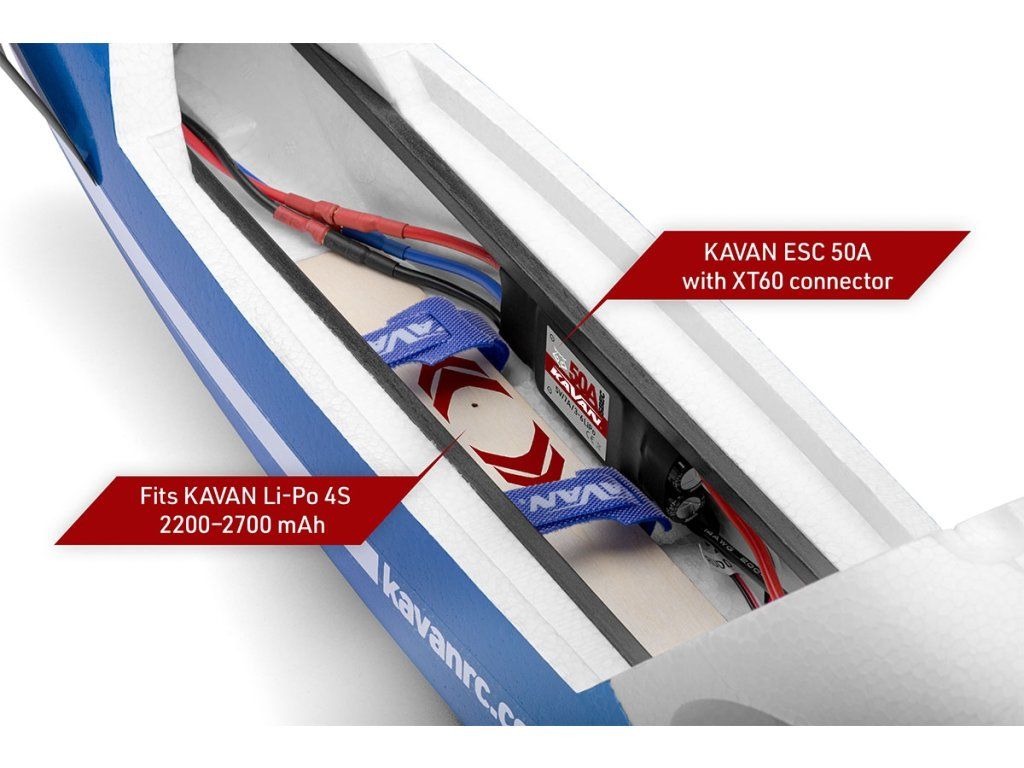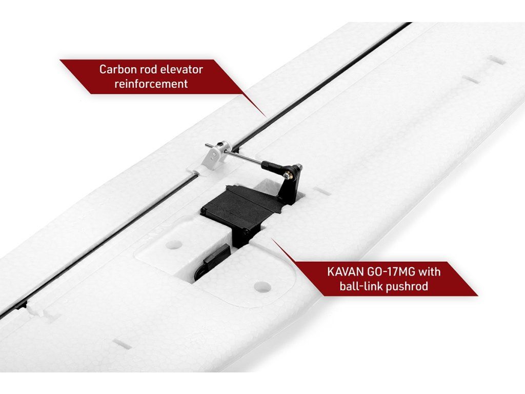 Motor *C3548-750 Regulátor *KAVAN R-50SB Vrtulové listy *11x8“ Akumulátor KAVAN 14,8V 2200 mAh 30/60C nebo KAVAN 14,8V 2600 mAh 40/80C Serva *4x GO-17MG RC souprava min. 6 kanálů počítačová *) Součást ARF setu