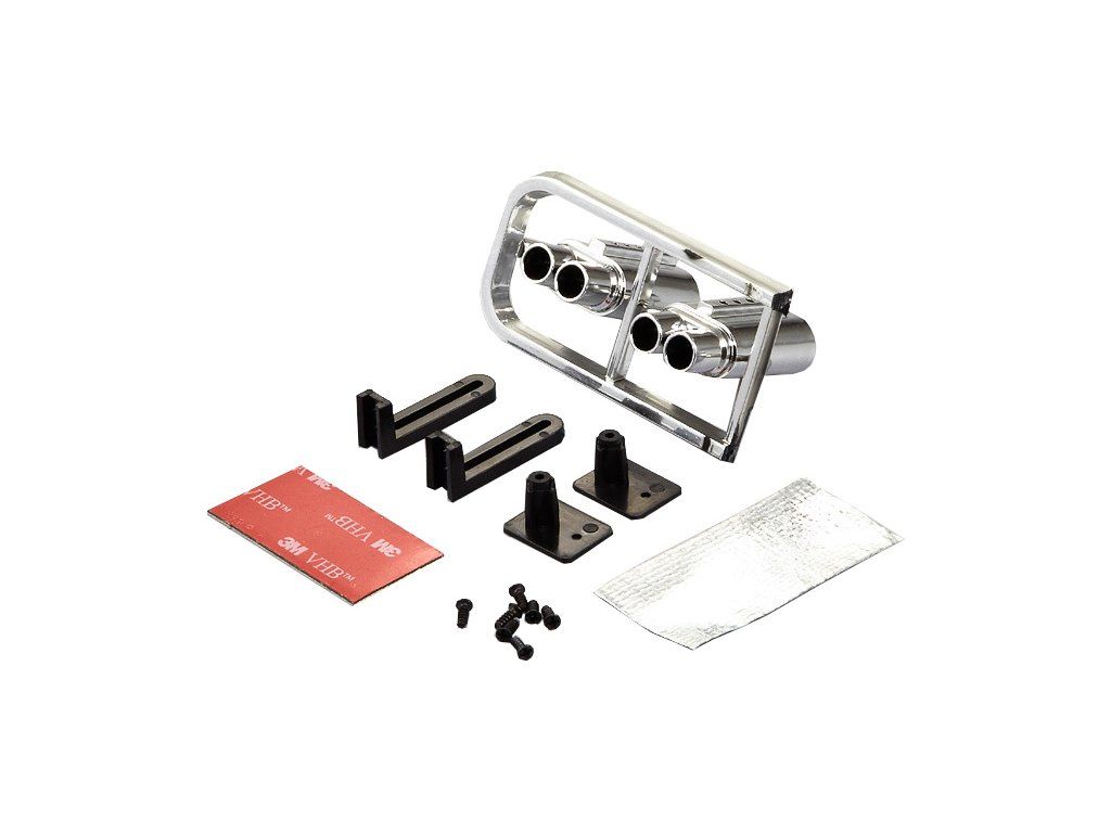 Chcete, aby Váš RC model auta 1:10 byl ještě realističtější? Killerbody vám nabízí detailně zpracovanou maketu koncovku výfuku v chromovaném provedení, vyrobenou z ABC materiálu. Maketa je s koncovkou dvojité výfukové trubky. Obsahem balené je 2 x koncovka výfuku, montážní sada, oboustranná lepící páska.