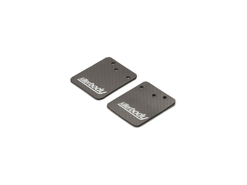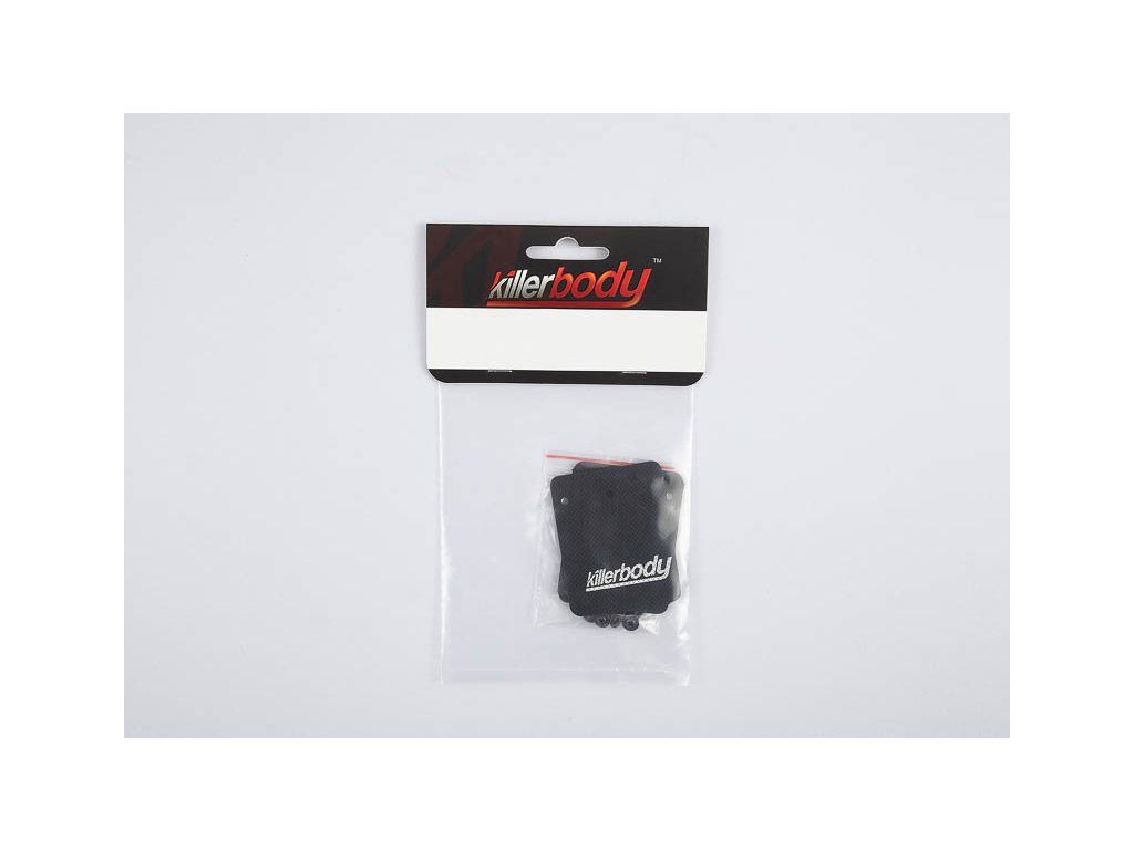 Černé gumové zástěrky pro RC model auta. Balení obsahuje 2 ks s logem Killerbody 43 x 55 mm, šroubky na připevnění.