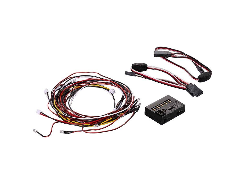 Balení obsahuje: řídící jednotku, 2 x 3 oranžové LED diody, 1 x 2 červené, LED diody, 3 x 2 bílé LED diody, 2 x Y-kabely - Rx/servo, Rx/regulátor. Originální a český návod.