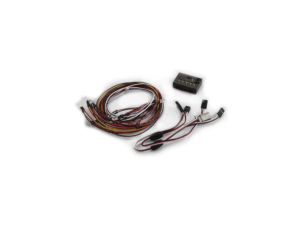 Balení obsahuje: řídící jednotku, 2 x 2 oranžové LED diody, 1 x 4 červené, LED diody, 1 x 6 bílé LED diody, 1 x 4 bílé LED diody, 2 x Y-kabely - Rx/servo, Rx/regulátor. Originální a český návod.