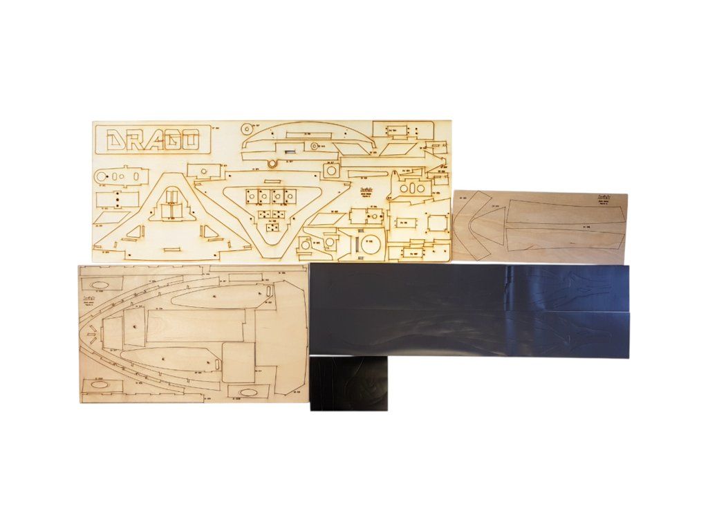 Balení obsahuje hotový trup, laserem vyřezané překližkové díly, karbonový stěžeň, předřezané plachty, ráhna, díly kování, různobarevná lana, samolepicí dekoraci s motivem draka a podrobný stavební návod.