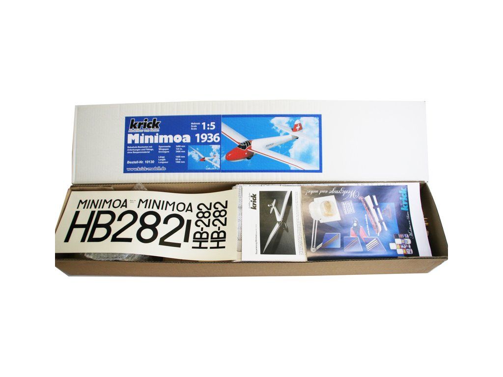 Stavebnice RC modelu legendárního větroně Minimoa 1936 v měřítku 1:5 o rozpětí 3,4m od firmy Krick. Konstrukční celodřevěný model je přesně zpracován v měřítku. Sada obsahuje všechny dřevěné díly z balsy nebo překližky, které jsou nezbytné pro stavbu modelu, stejně jako drobné příslušenství.