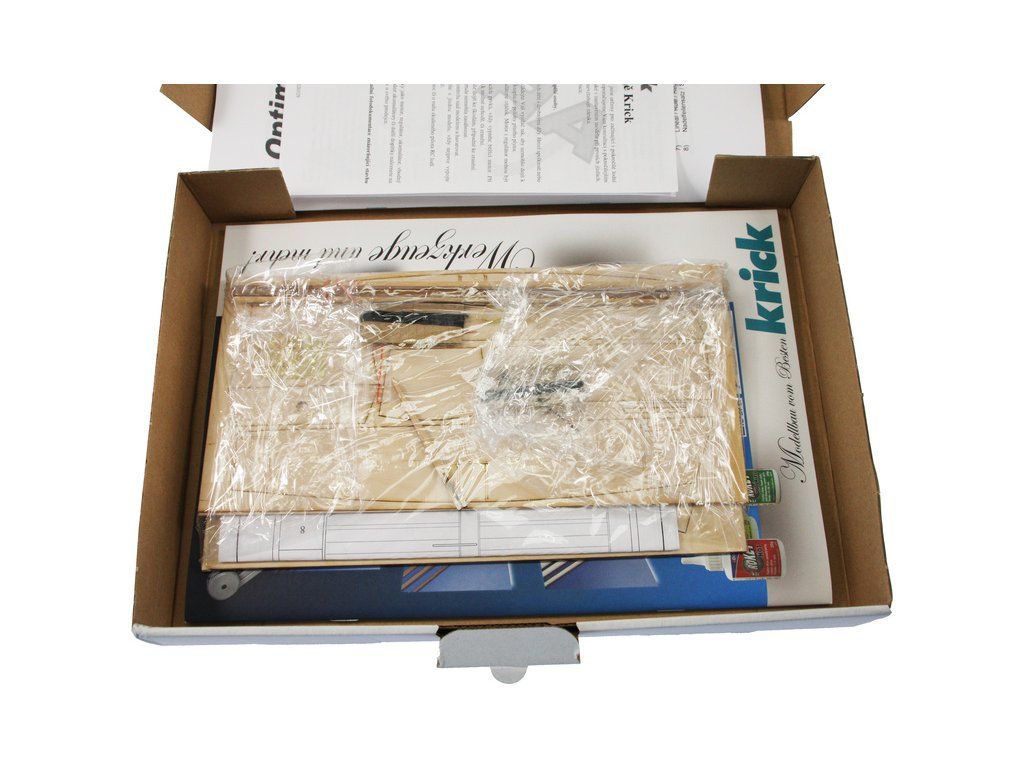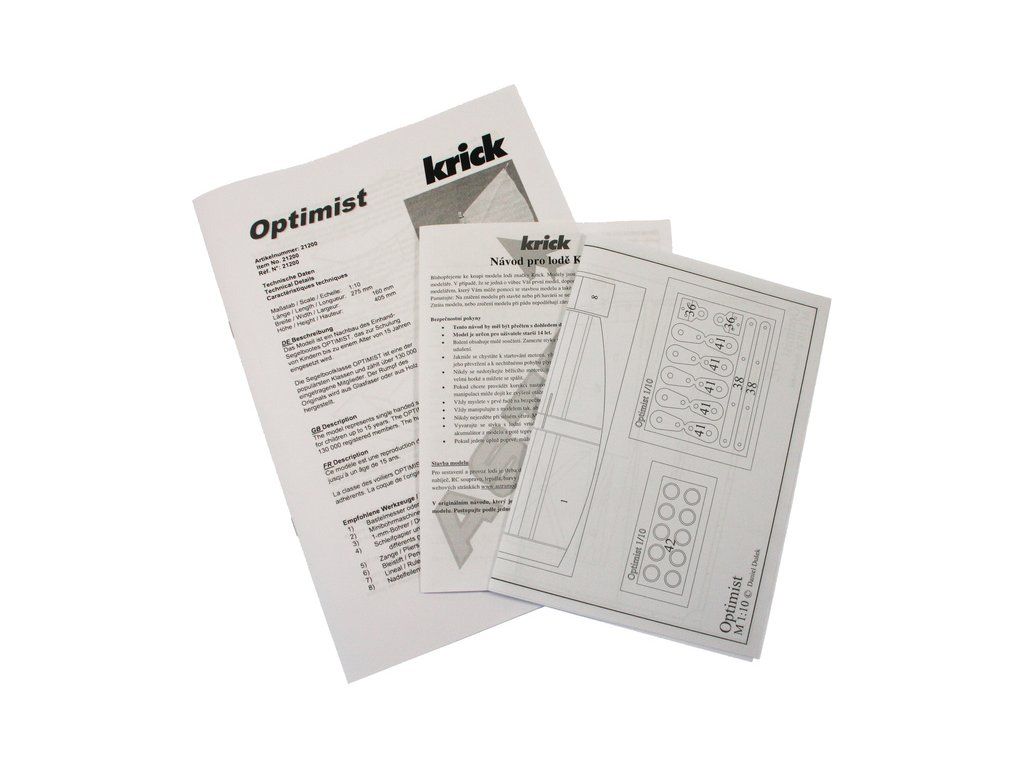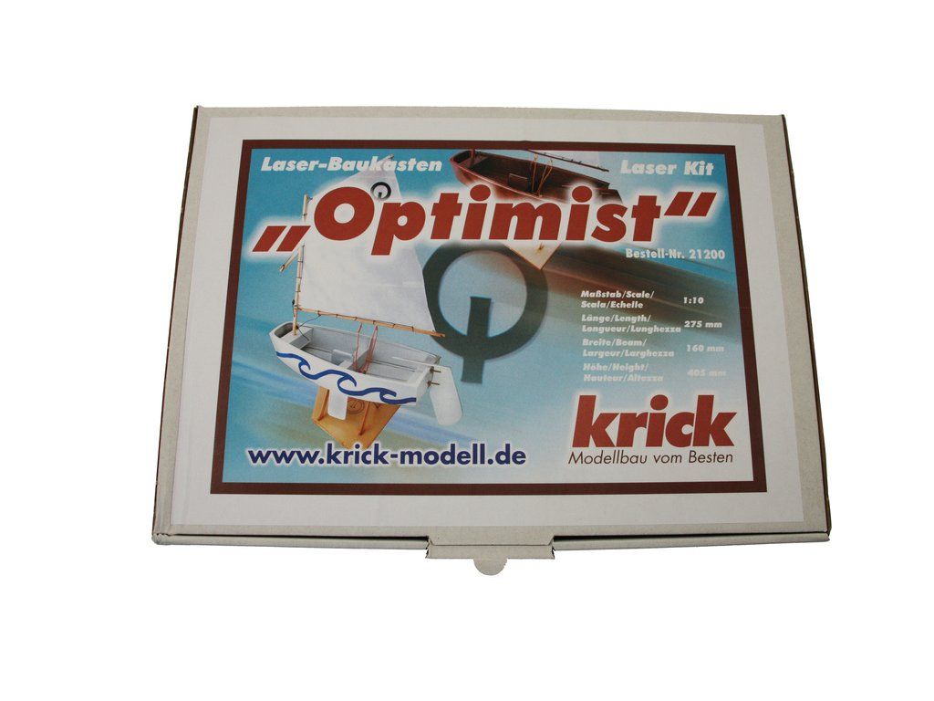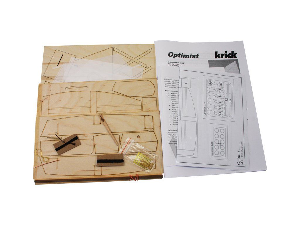 Model plachetnice Krick Optimist 1:10 je celodřevěná stavebnice malé lodičky pro začínající lodní modeláře. V balení jsou laserem vyřezané překližkové součásti, drobné příslušenství, plachta a plán 1:1 s návodem.
