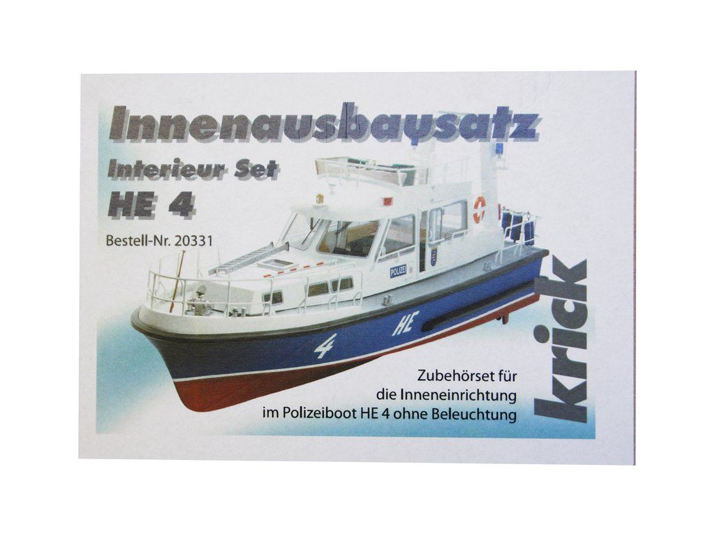 Sada maketových dílů vnitřní vestavby trupu modelu lodi Krick Policejní člun HE 4. Sada obsahuje laserem vypálené plastové a překližkové díky, maketové doplňky a lanoví.