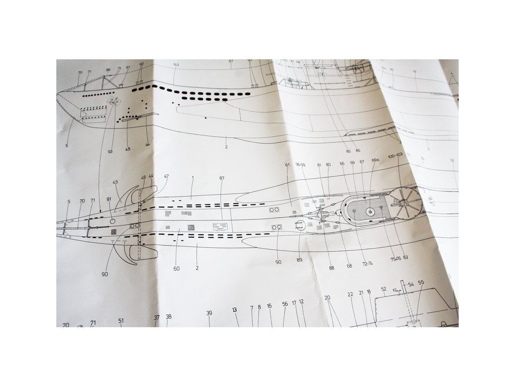 Sada plastových výlisků z ABS, deska s přepážkami, kovové díly, 2 lodní šrouby s hřídelemi a vodícími trubičkami, výlisky zbraní, kormidla a spojovací materiál. Stavební výkres, český návod, manuál EN.
