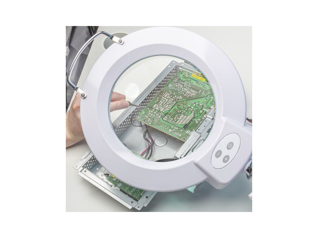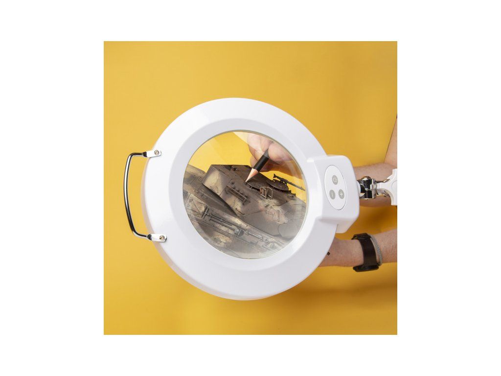 Lightcraft stolní plně stavitelná lampa s LED osvětlením a skleněnou lupou o průměru 175 mm a zvětšením 1,75x. Klouby a ramena jsou vyrobena z kovu.
