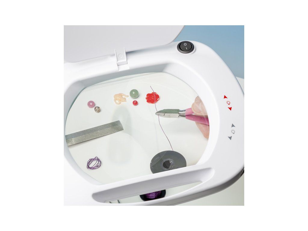 Špičková stolní lampa s lupou o rozměru 15 x 18 cm a LED osvětlením s nastavitelnou intenzitou a CRI. Ramena a klouby lampy jsou vyrobené z oceli. Díky vestavěným pružinám je pozice lampy snadno nastavitelná.