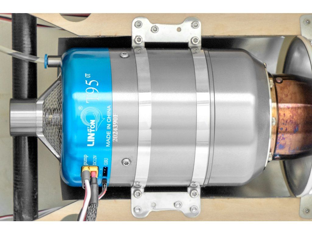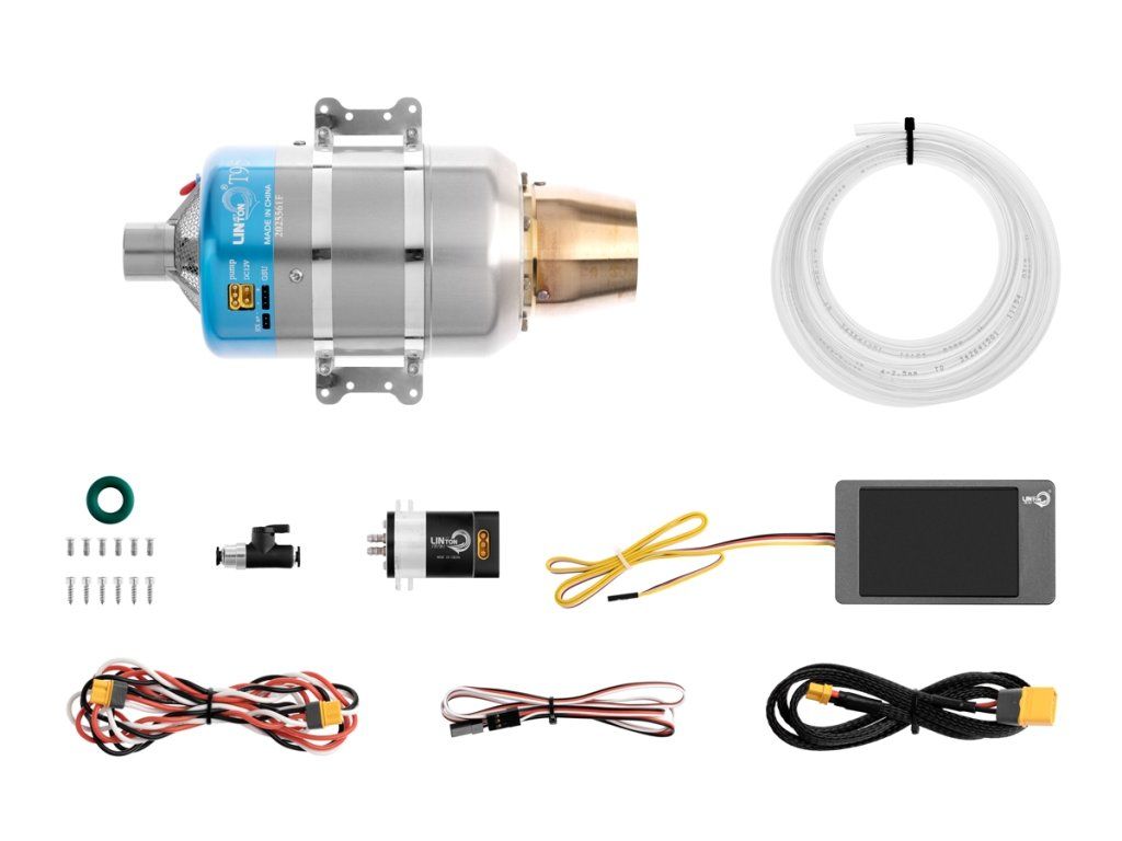 Sada motoru obsahuje: Proudový motor Linton T95-GT s řídící jednotkou, motorové lože, pozemní programovací jednotku, palivové čerpadlo, sadu upevňovacích šroubů, palivové potrubí, sadu kabelů a náhradních dílů, návod.
