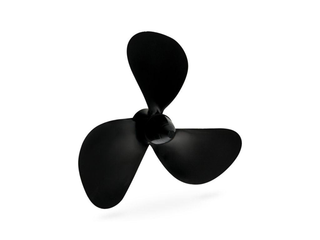 Lodní šroub třílistý pro montáž pod loď, stoupání 0,53x průměr, plast plněný skelnými vlákny, závit M2.