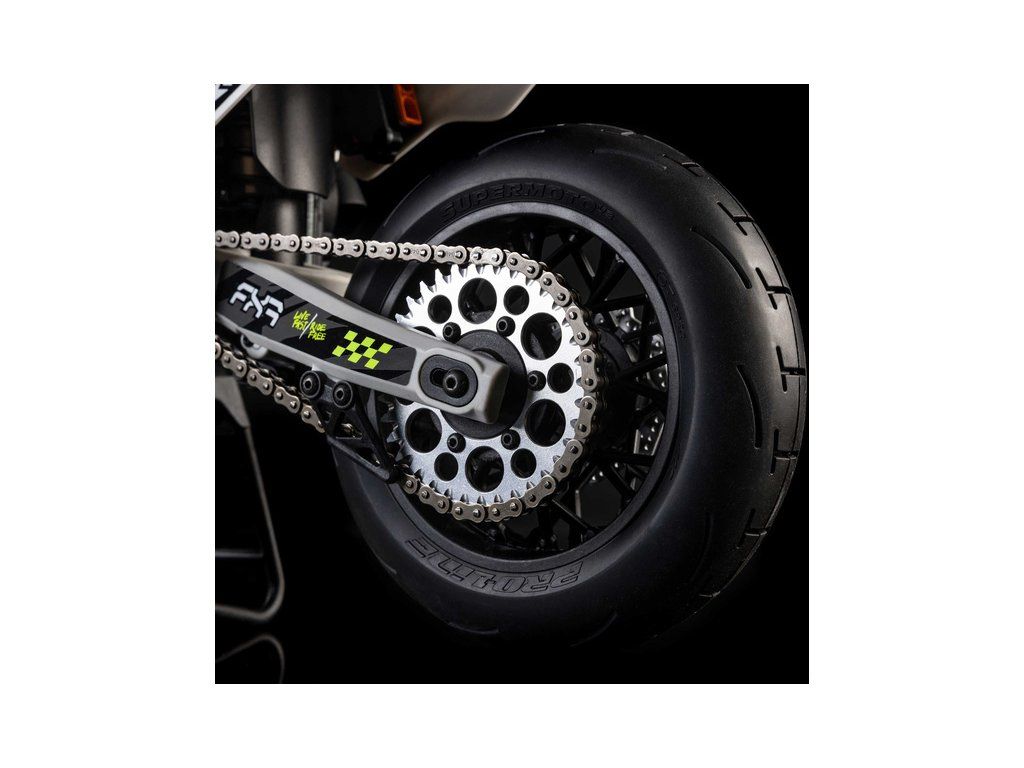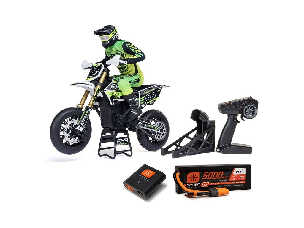 Obsahem balení je sestavený RC model motocyklu Losi Promoto-SM 1:4 FXR s nainstalovanými komponenty: střídavý motor Firma 3652 3800kv, regulátor Firma 85A Smart - Promoto , přijímač DSMR 6CH - ProMoto, servo řízení S620PM ProMoto MG, servo přední brzdy SX108PM ProMoto Micro MG, jednotka setrvačníku. Spektrum DX3 DSMR Smart vysílač ProMoto, pohonná baterie Spektrum Smart G2 LiPo 7.4V 5000mAh 50C HC IC5, nabíječ Spektrum Smart S120 20W USB-C a 4x AA baterie do vysílače. Příslušenství: stojánek, startovací stojánek, 2x hřebík pro ukotvení stojánku, 2x plochý klíč 6/9 mm, klíč páky, vymezovače napínání řetězu, olej na řetěz. Návod CZ, průvodce rychlým stratem a manuál EN, DE, FR, IT.