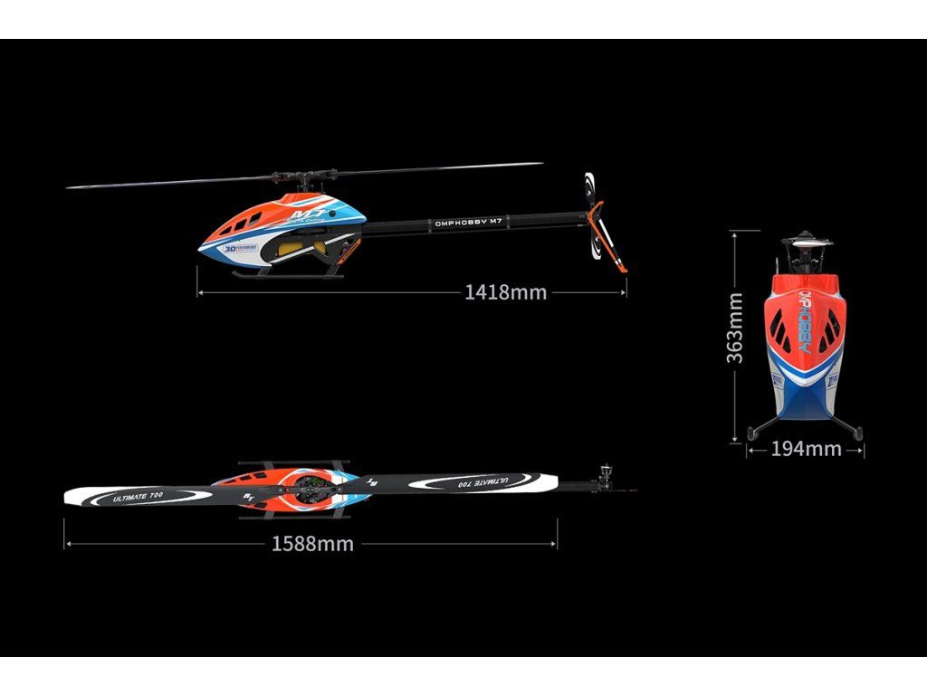 OMP HOBBY M7 je vysokovýkonný vrtulník třídy „700“ konstruovaný tak, aby při instalaci odpovídajícího motoru a elektroniky vyhověl požadavkům pilotů, kteří s velkými vrtulníky teprve začínají, sportovním letcům, maketářům i 3D borcům. Při návrhu M7 byl kladen důraz na minimalizaci setrvačných momentů ve všech třech osách, což spolu se systémem ovládání nosného a vyrovnávacího rotoru s velkým rozsahem výchylek nabízí neuvěřitelnou autoritu řízení a obratnost.