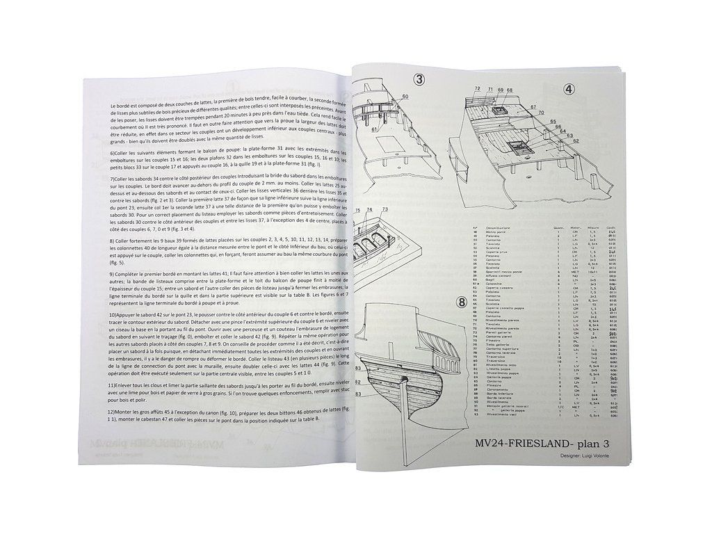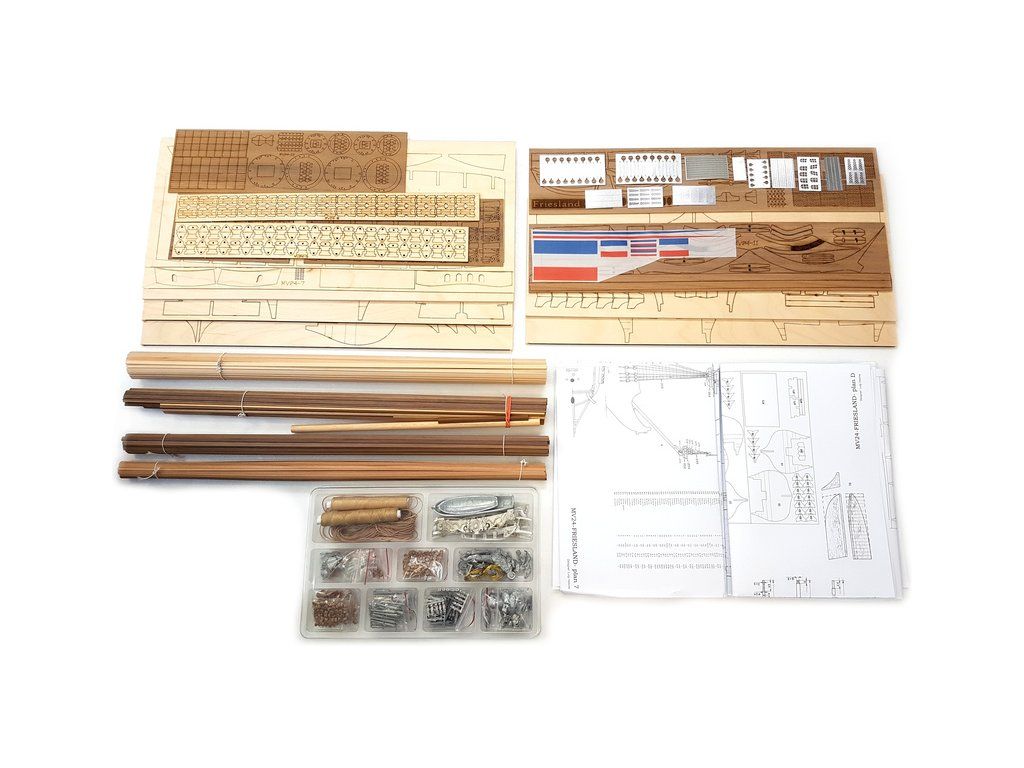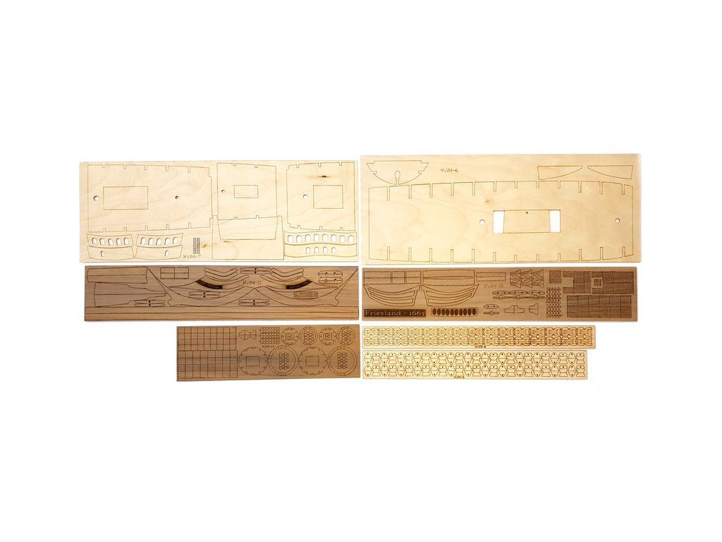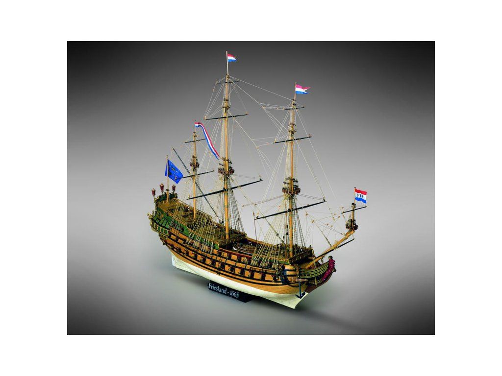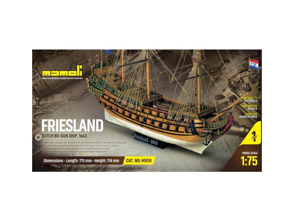 Stavebnice neplovoucího modelu lodi MAMOLI Friesland 1663 v měřítku 1:75. Délka modelu 775 mm, výška 714 mm. Stavba převážně ze dřeva s bohatými doplňky, součástí je stavební plán. Autentické detaily, 80 děl, propracované kovové odlitky. Laserem řezané díly.