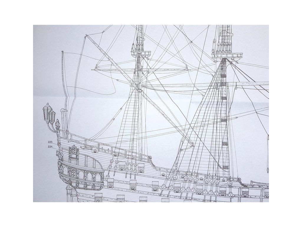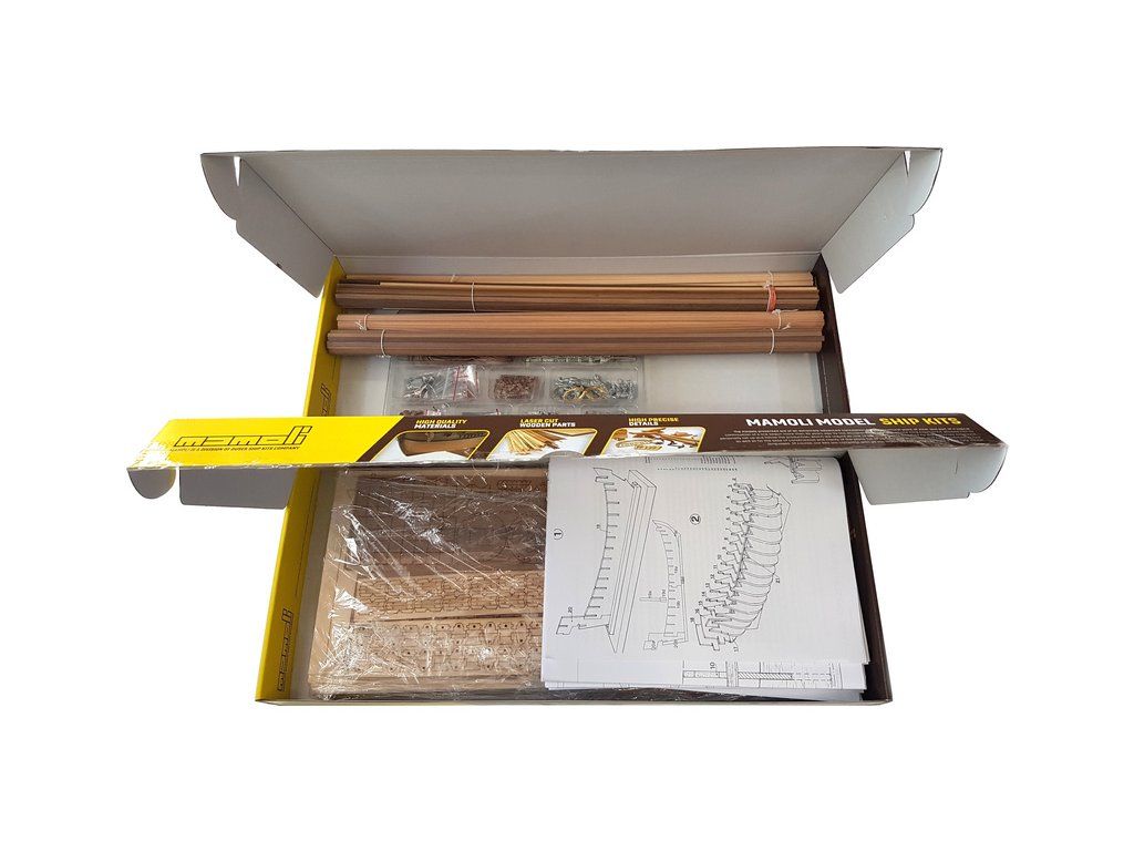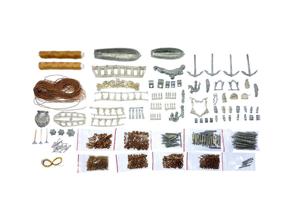 Balení obsahuje sadu překližkových dílů, dřevěných lišty, kovové odlitky, kovové destičky, lanoví, maketové doplňky, vlajky, sadu výkresů a manuál EN, DE, FR a IT.