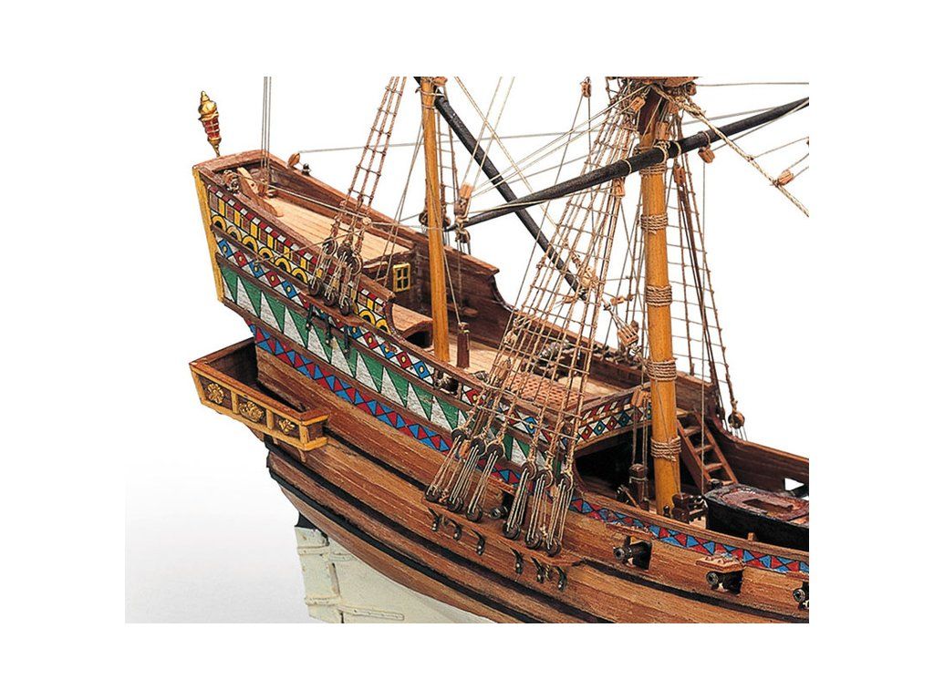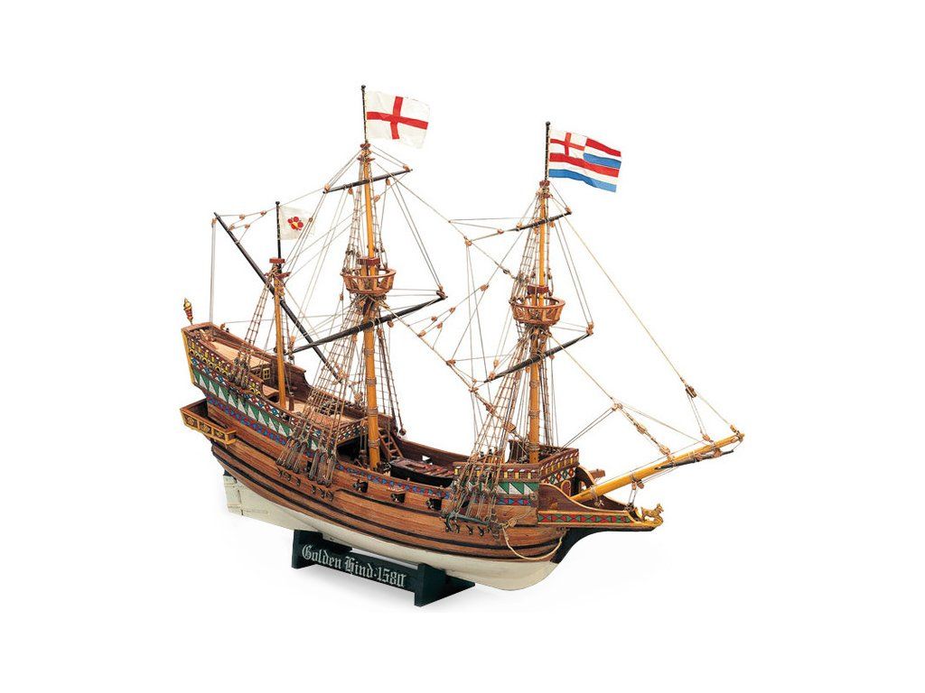 Stavebnice neplovoucího modelu MAMOLI Golden Hind v měřítku 1:53 z roku 1577. Loď použil Sir Francis Drake při jeho plavbě kolem světa v roce 1577. Loď měla délku trupu cca 25 metrů a výtlak 120tun. Výzbroj lodi tvořilo 18 děl. Model má délku 495mm. V balení jsou dřevěné díly, lišty a množství kování, lanoví, plány atd.