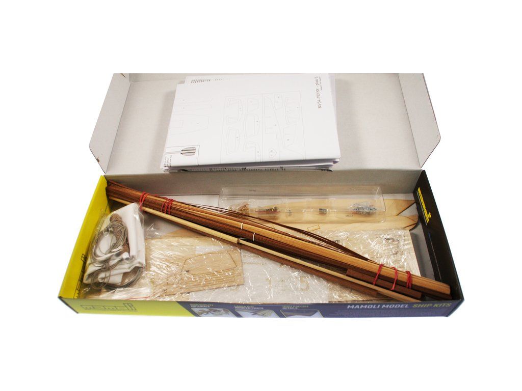 Balení obsahuje sadu překližkových dílů, sadu dřevěných lišt o různém průřezu, blistr s drobnými díly, sadu výkresů a manuál anglický, německý, francouzský a italský.