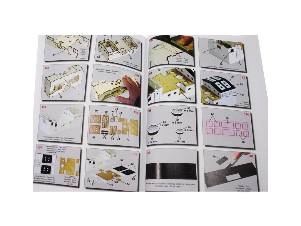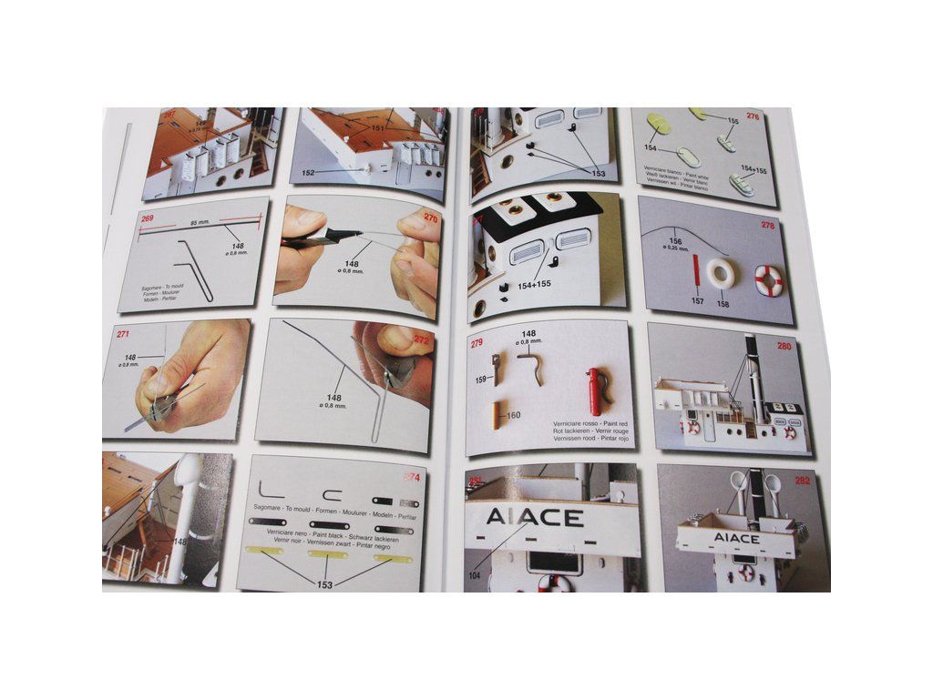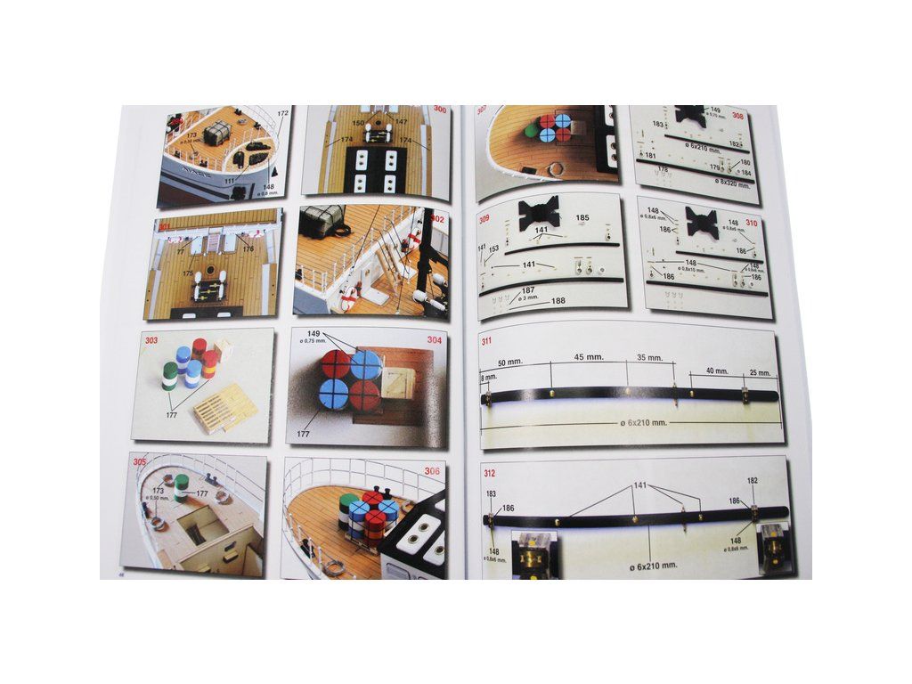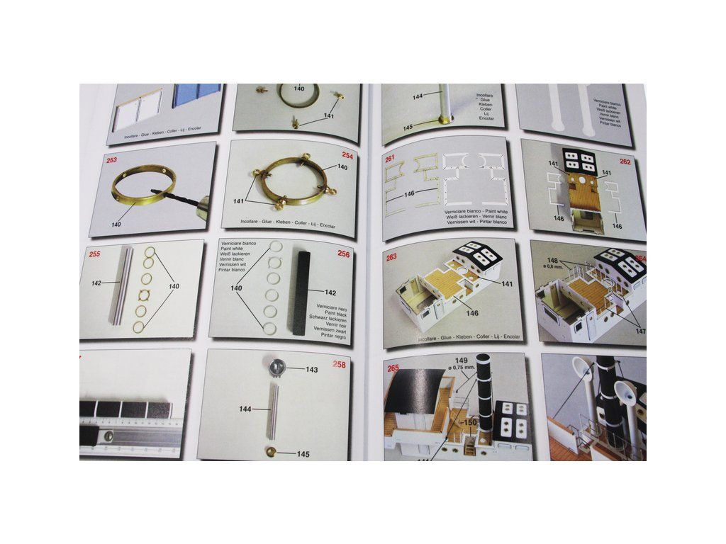 Balení obsahuje sadu překližkových dílů, sadu dřevěných lišt o různém průřezu, blistr s drobnými díly, díly z mosazi, sadu výkresů a vícejazyčný manuál.
