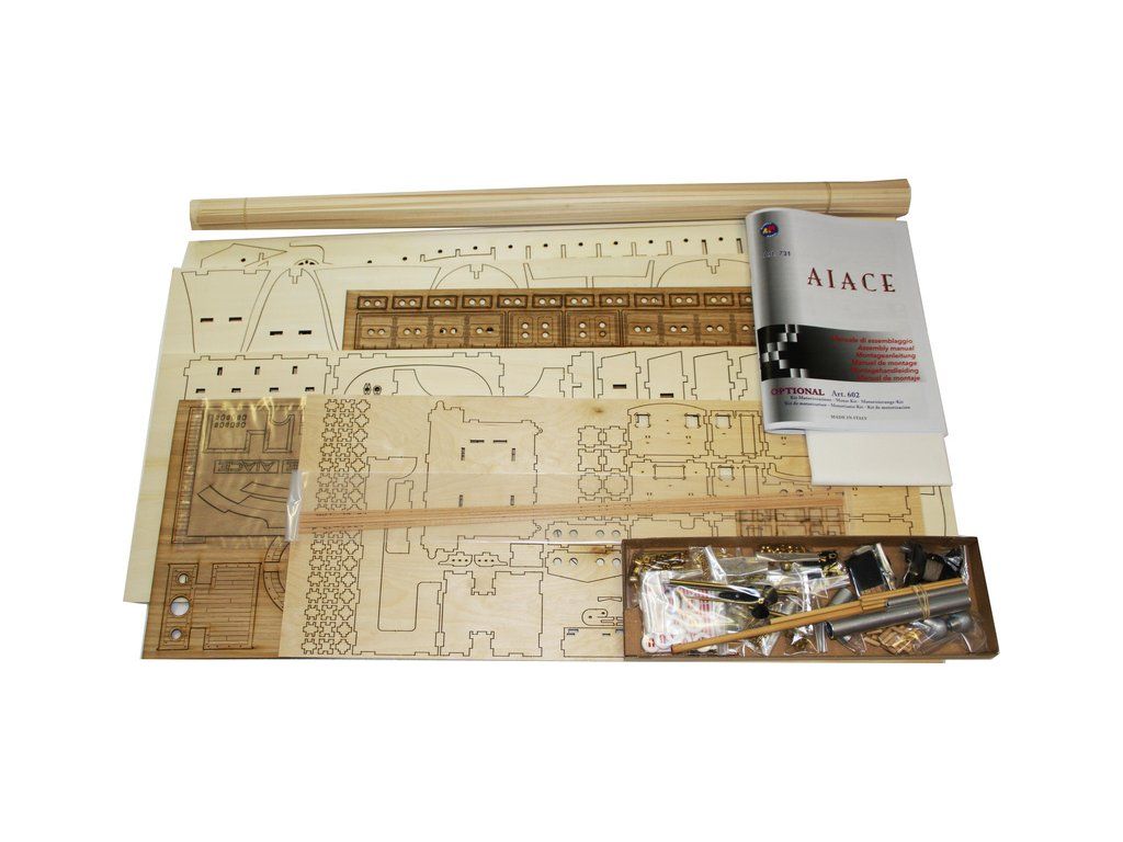 Stavebnice modelu lodi Mantua Model Aiace v měřítku 1:40 a délce 840mm. Dřevěný model s klasickou stavbou můžete mít jako statickou maketu anebo funkční, poháněnou volitelným elektromotorem. Obrazový návod krok za krokem, sada dřevěných a kovových dílů.