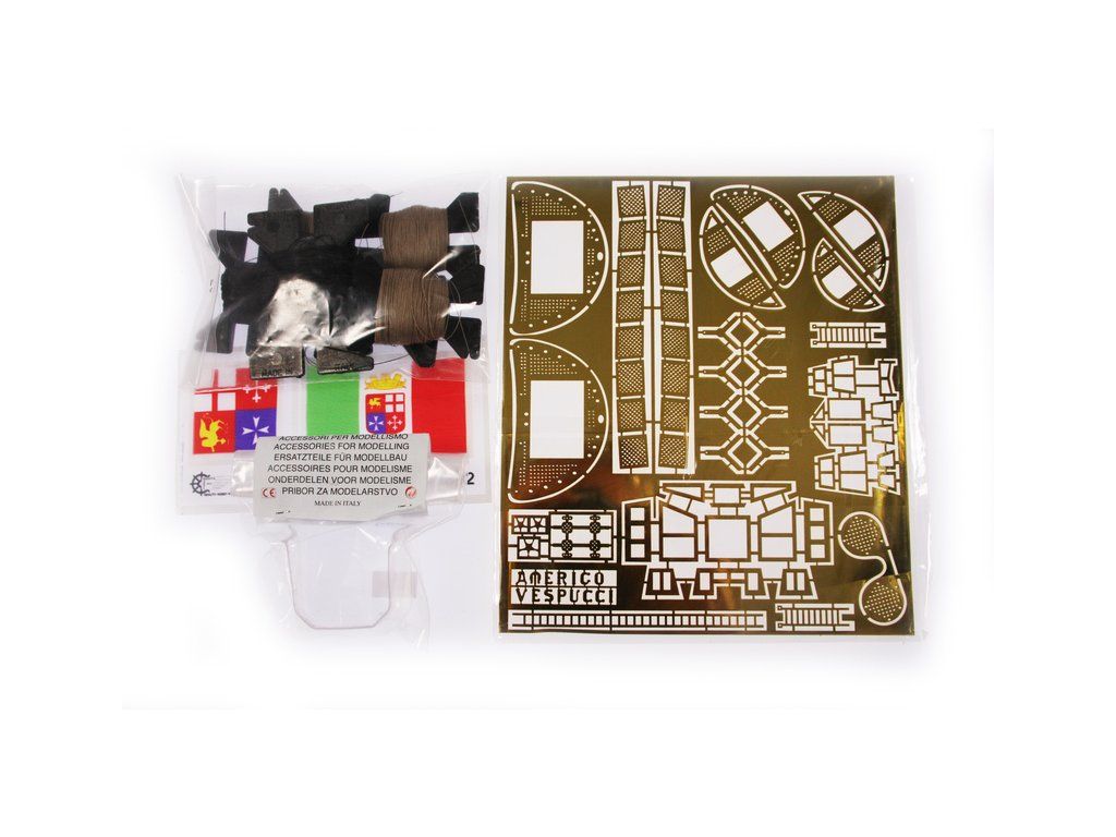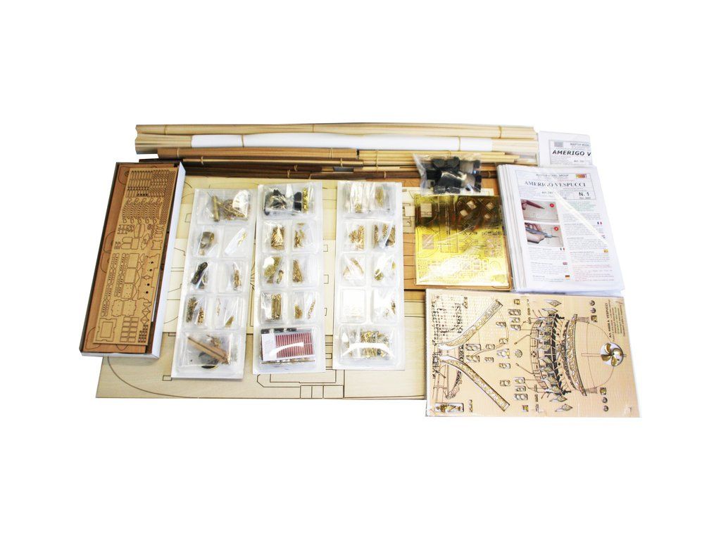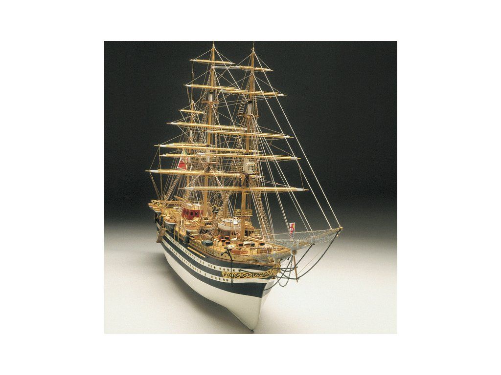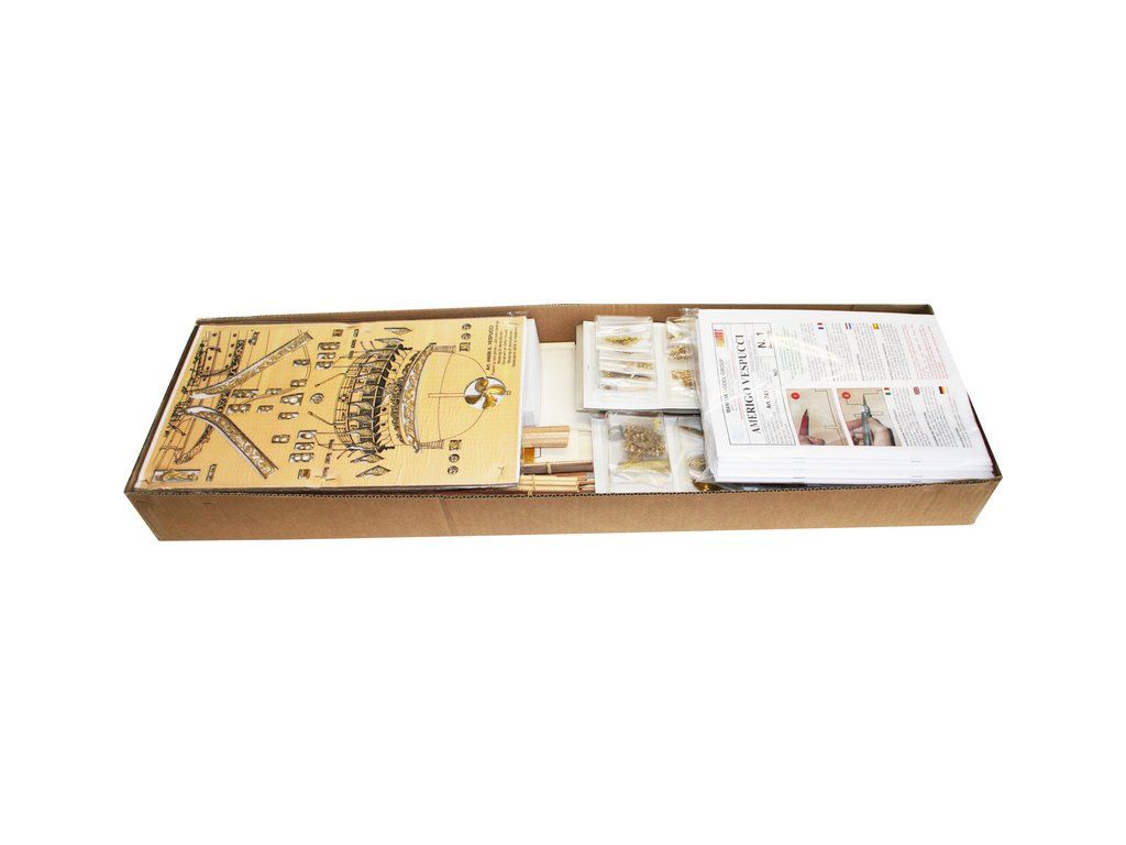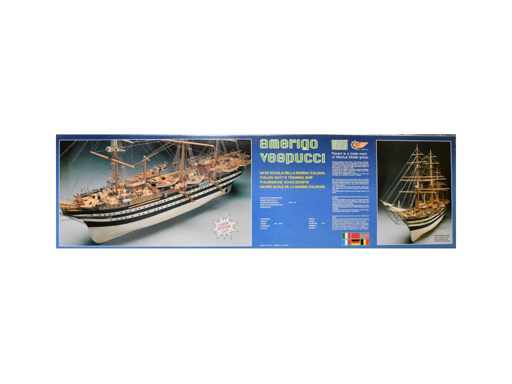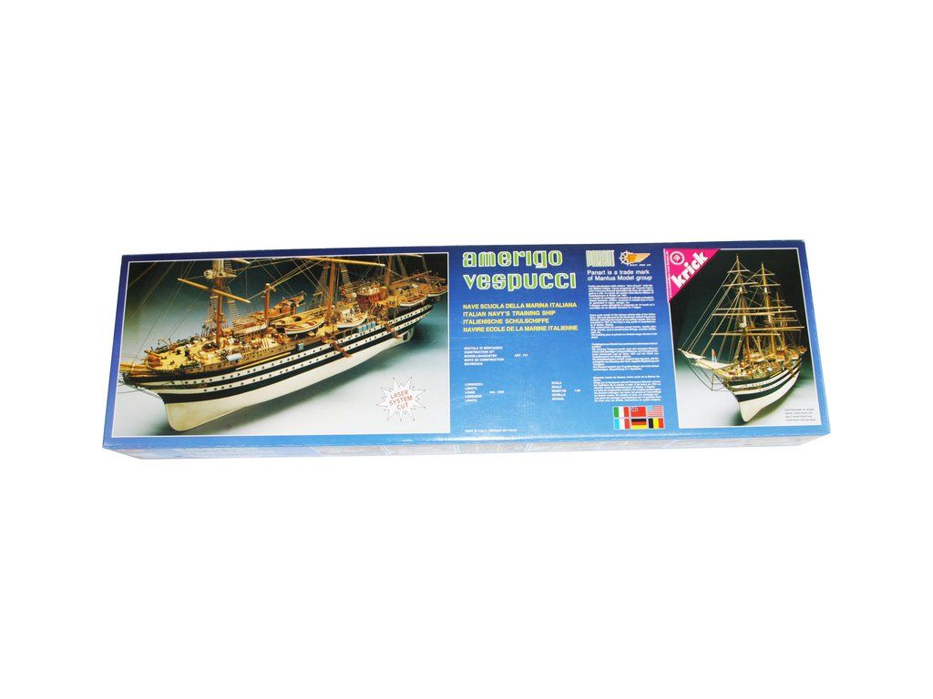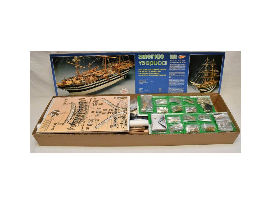 Stavebnice neplovoucího modelu lodi Mantua Model Amerigo Vespucci v měřítku 1:84 a délce 1250mm. Výcviková loď byla postavena v roce 1931 jako replika lodí z 18. století. Kit obsahuje dřevěné díly, kovové odlitky dekorací a podrobné stavení plány.