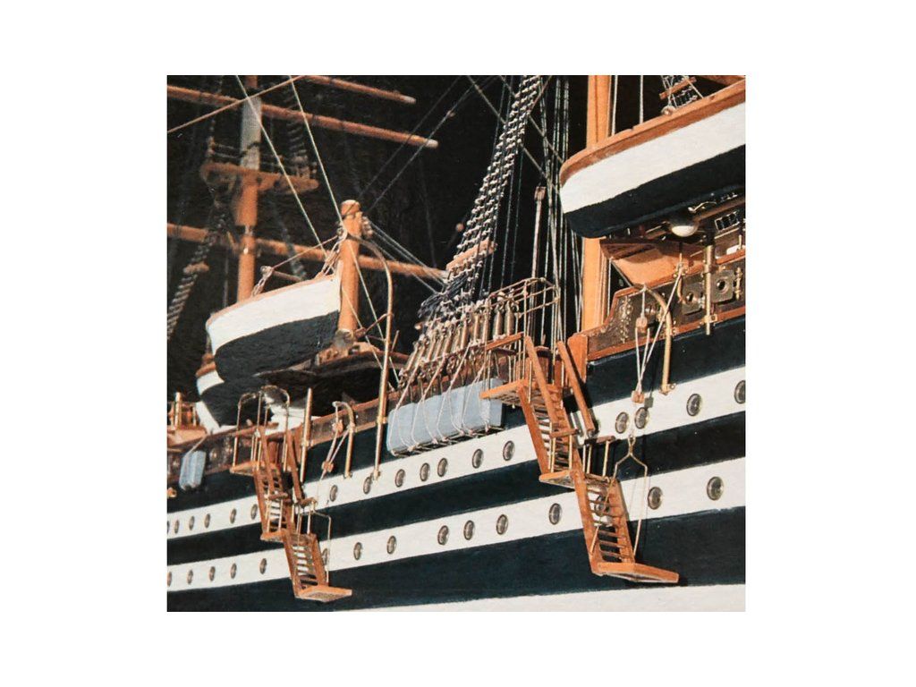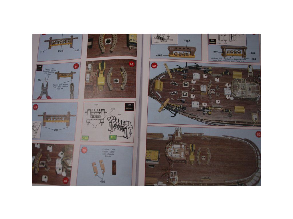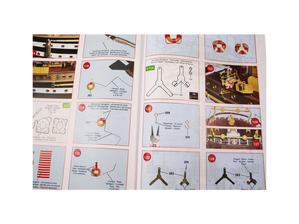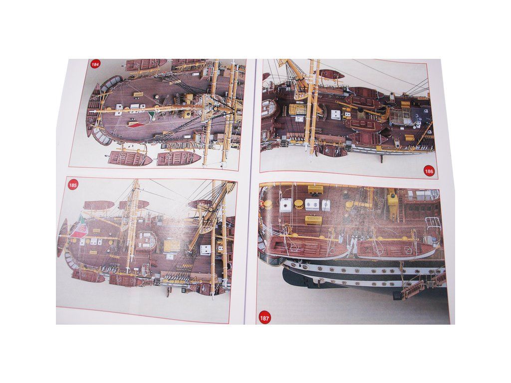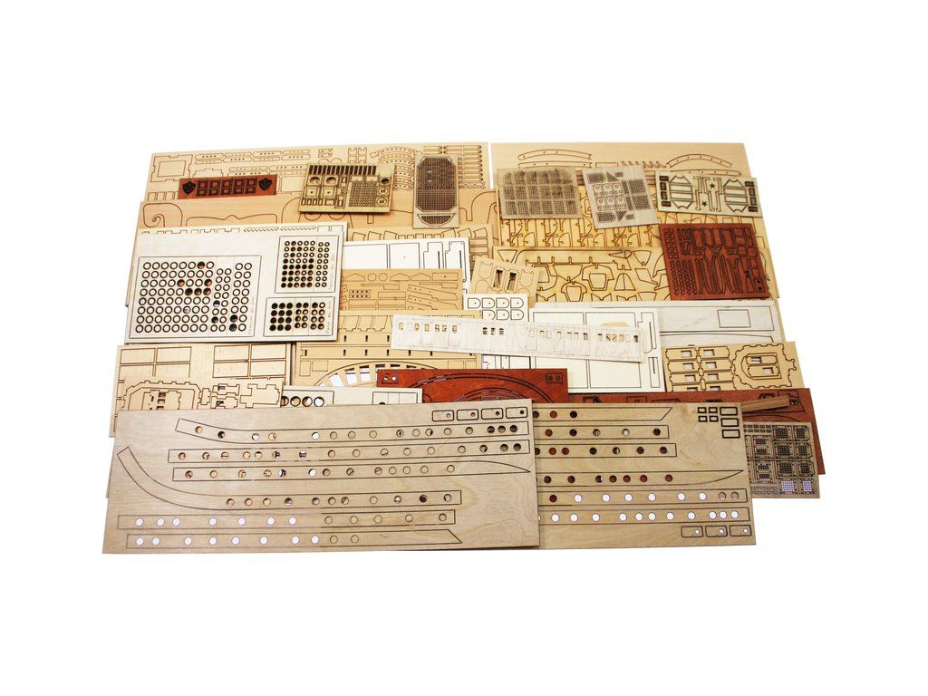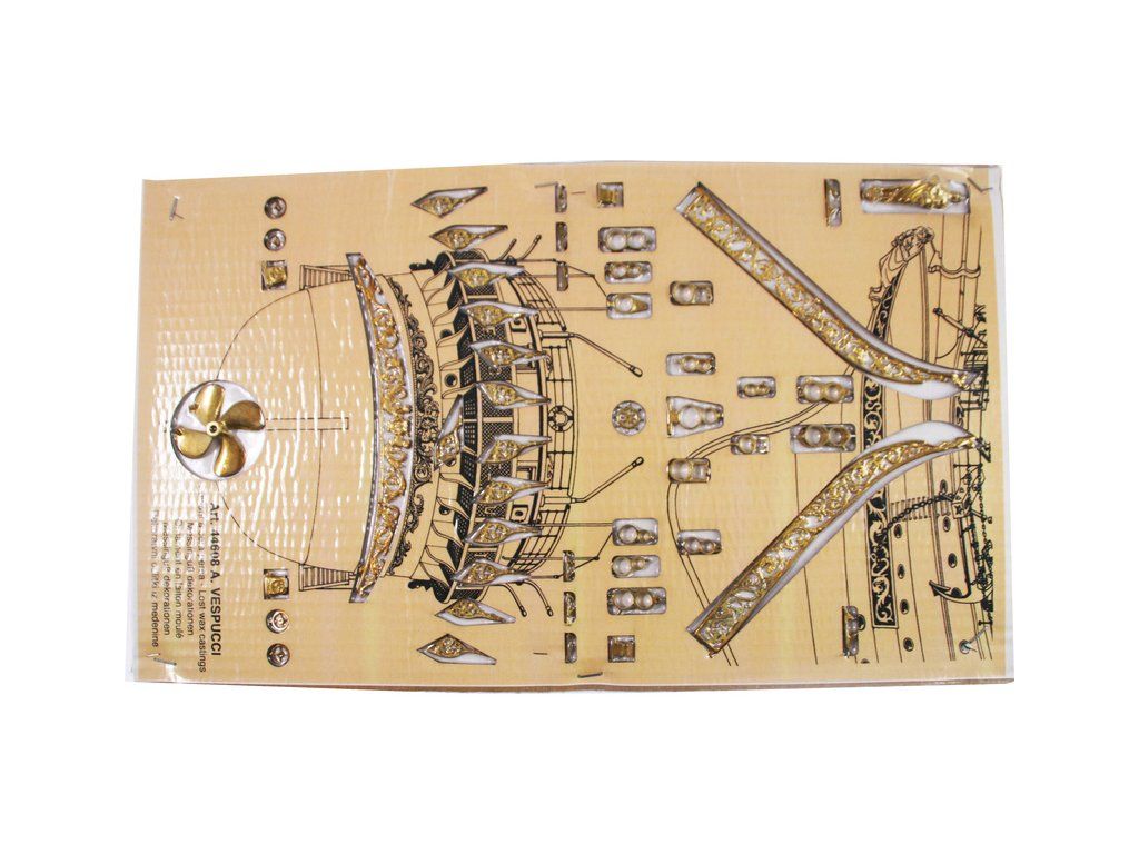 Balení obsahuje laserem řezané dřevěné díly, plaňky, paluby, stožáry, kovové a dřevěné kování, kovové odlitky a dekorace vyleptané z mosazi. Stavební plány, podrobný obrázkový vícejazyčný návod.