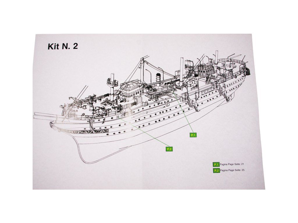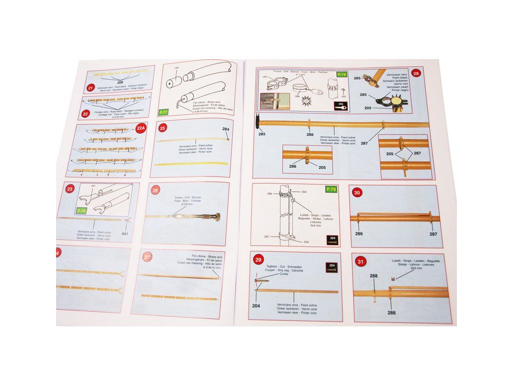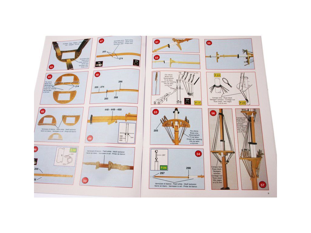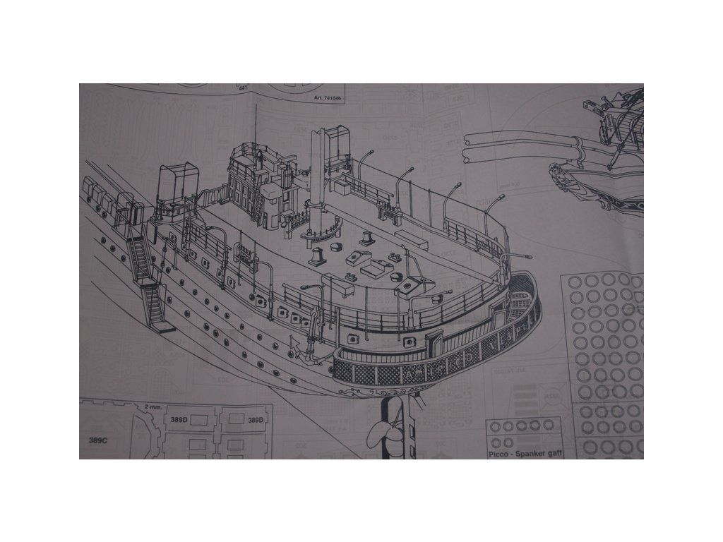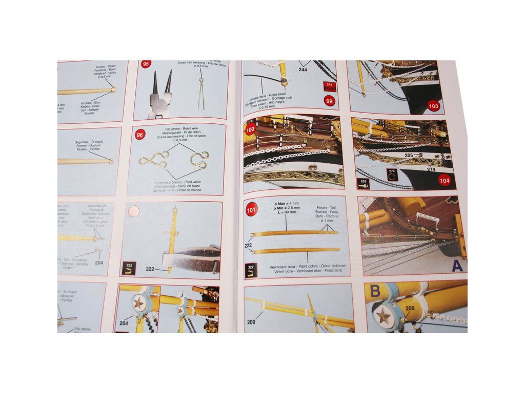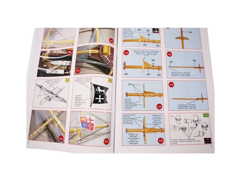 Balení obsahuje laserem řezané dřevěné díly, plaňky, paluby, stožáry, kovové a dřevěné kování, kovové odlitky a dekorace vyleptané z mosazi. Stavební plány, podrobný obrázkový vícejazyčný návod.
