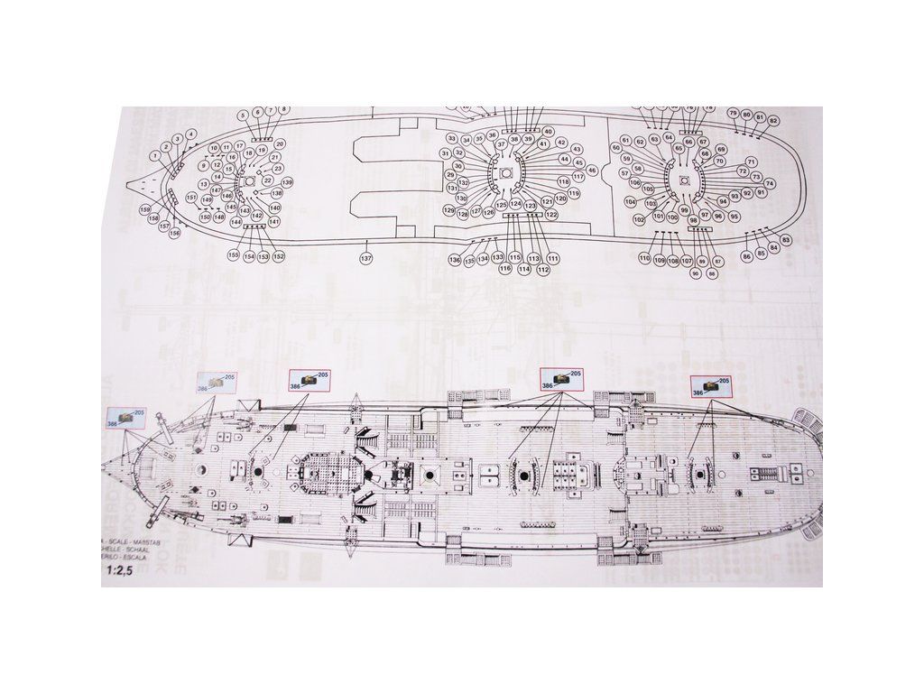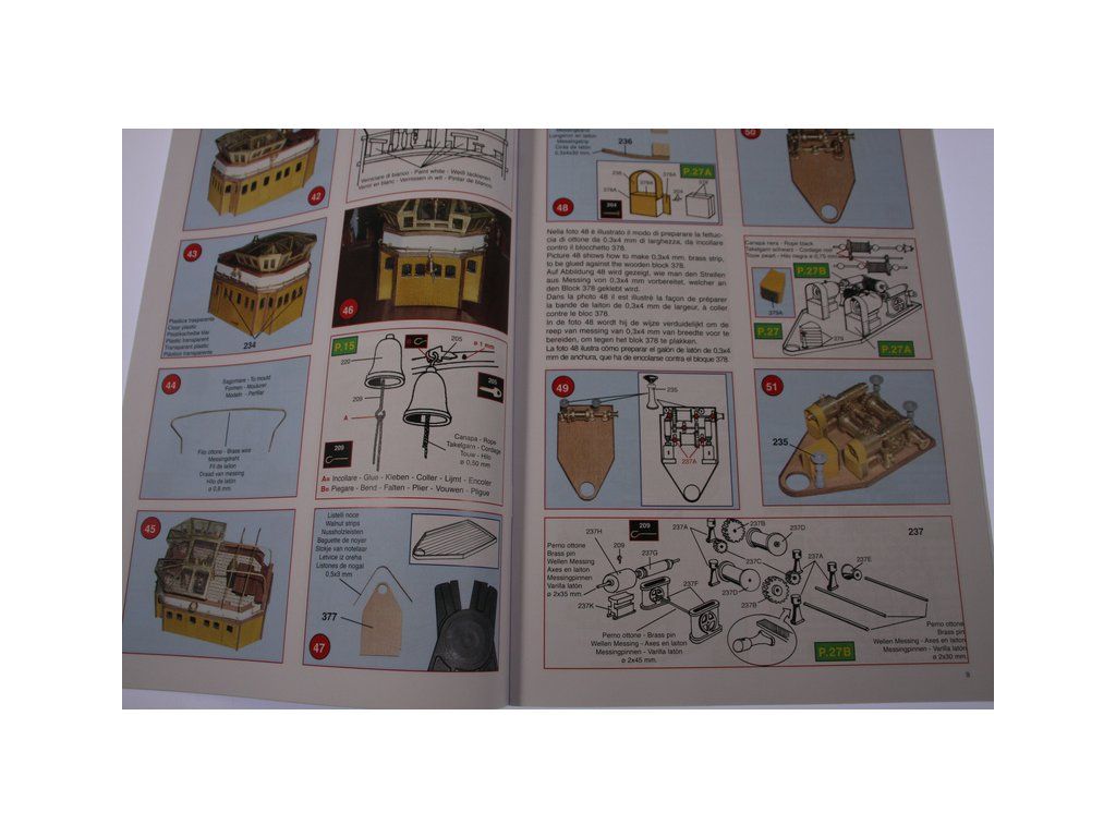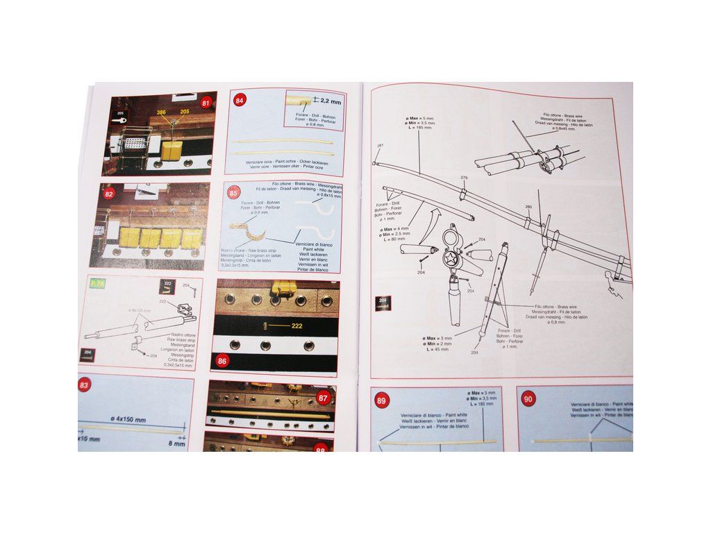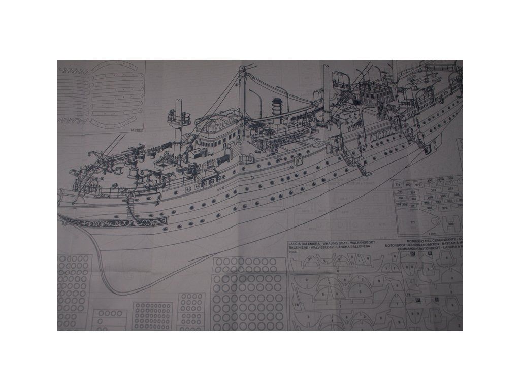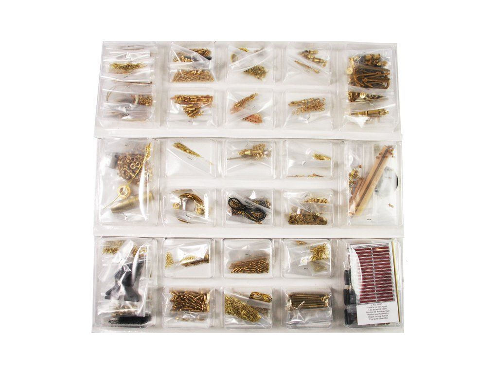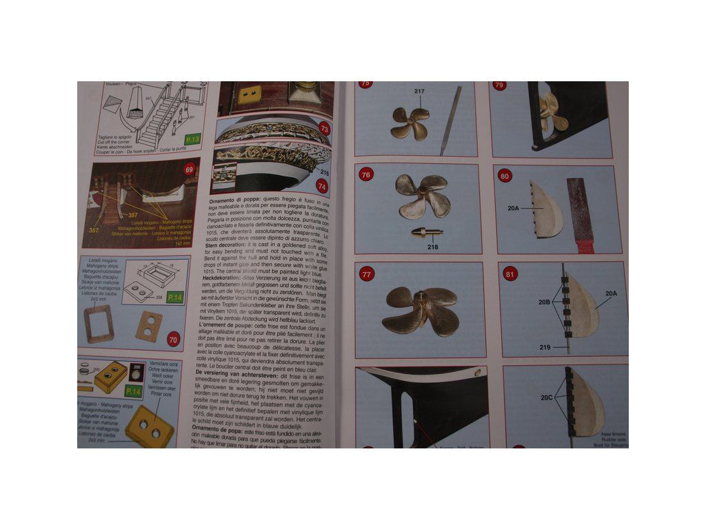Balení obsahuje laserem řezané dřevěné díly, plaňky, paluby, stožáry, kovové a dřevěné kování, kovové odlitky a dekorace vyleptané z mosazi. Stavební plány, podrobný obrázkový vícejazyčný návod.