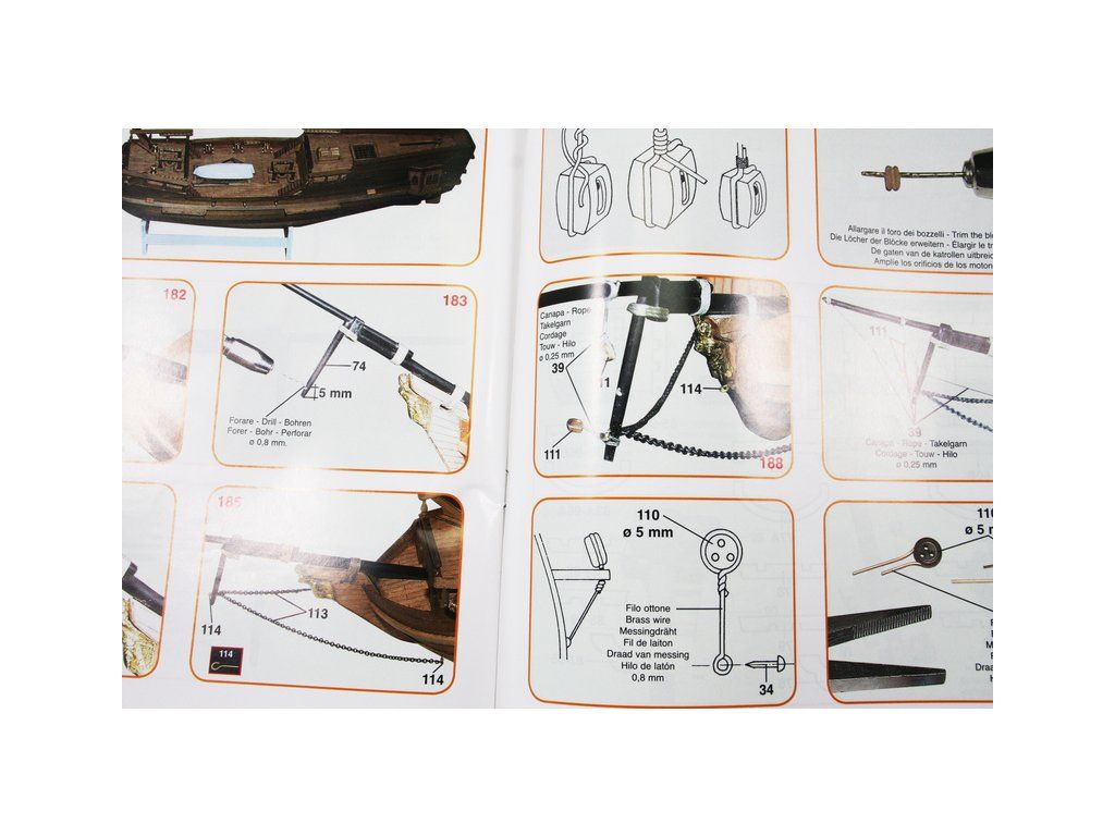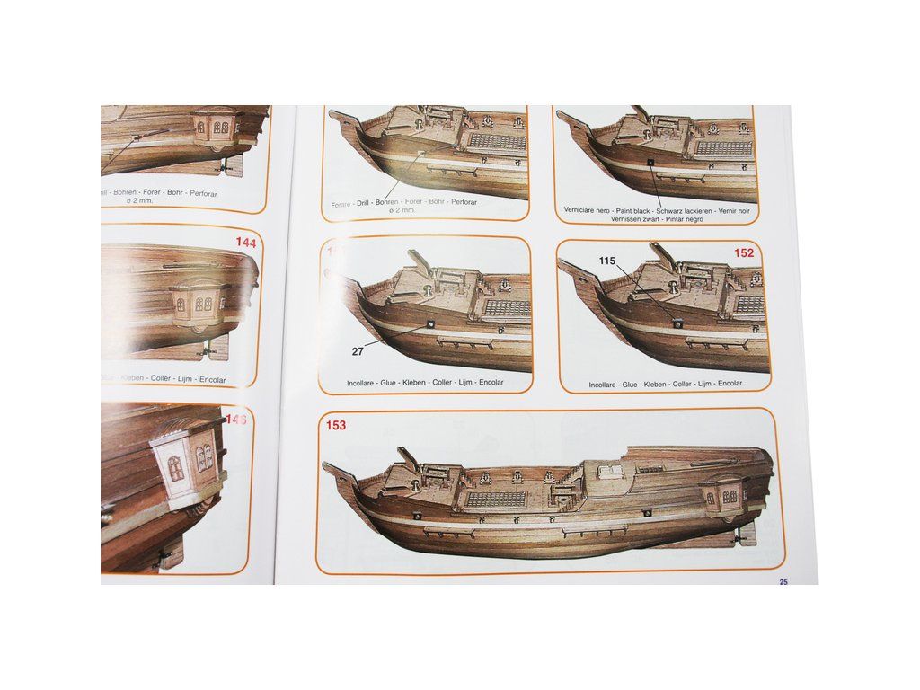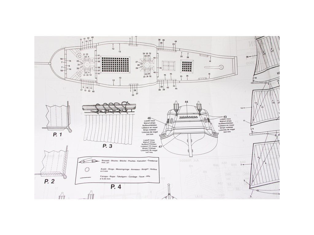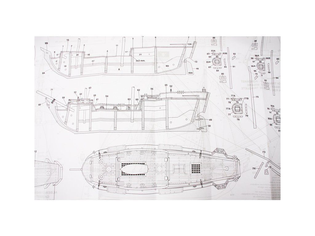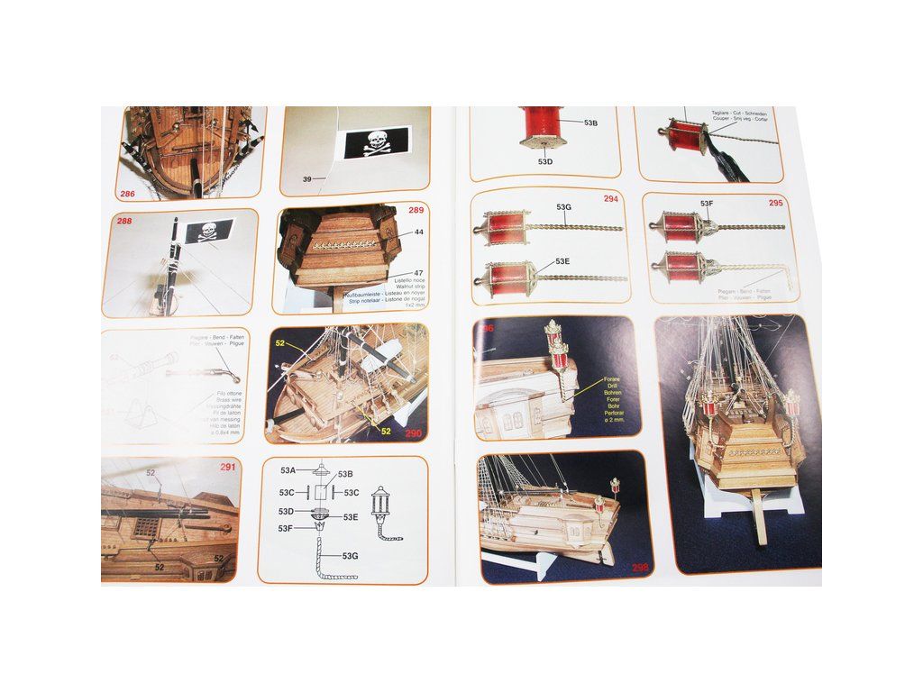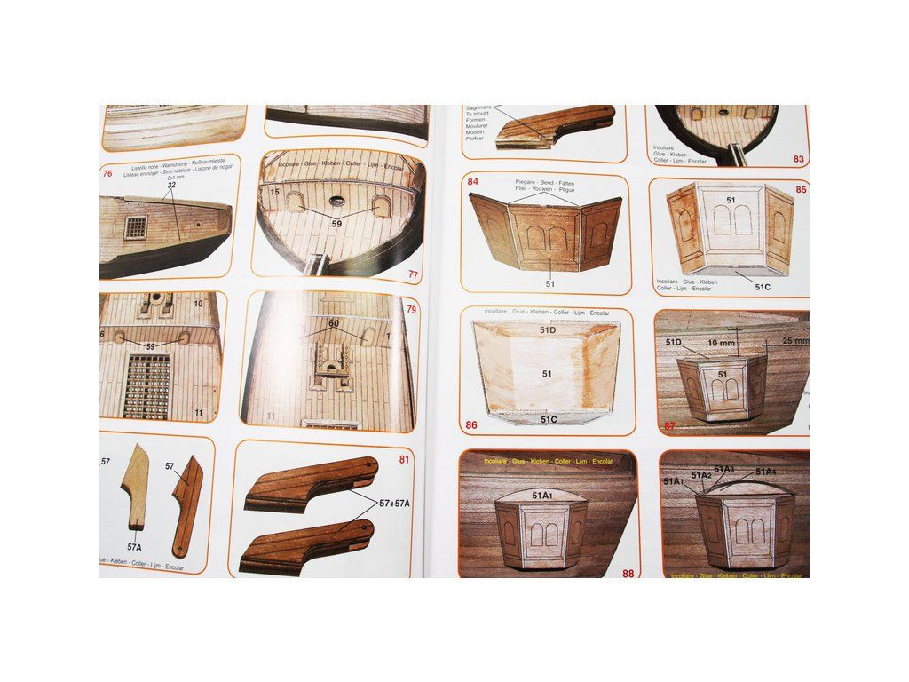 Balení obsahuje laserem řezané dřevěné díly, plaňky, paluby, sadu lišt, kovové a dřevěné součásti, kovové odlitky a dekorace. Stavební plány, vícejazyčný návod.