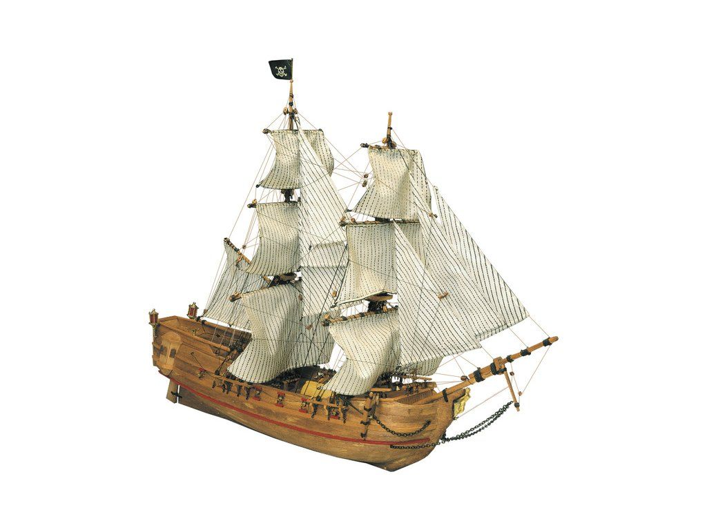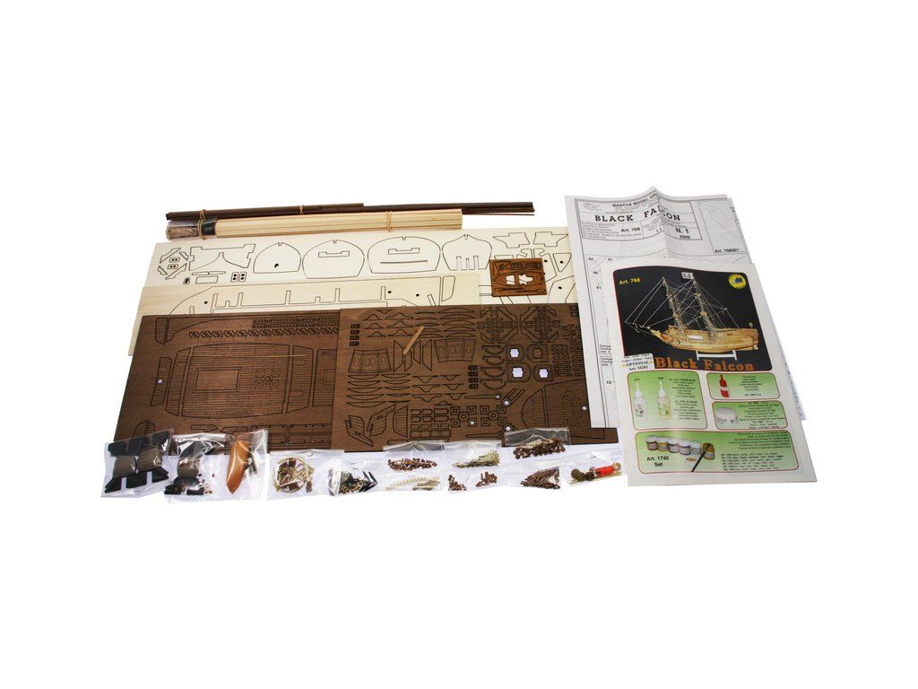 Stavebnice neplovoucího modelu lodi Mantua Model Black Falcon v měřítku 1:100 a délce 456 mm. Dvoustěžňová briga z 18. století, které velel nechvalně známý pirátský kapitán Kidd. Kit obsahuje dřevěné díly, kovové odlitky dekorací a podrobné stavební plány.