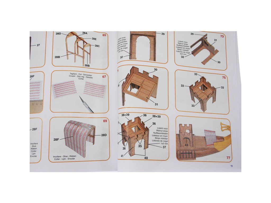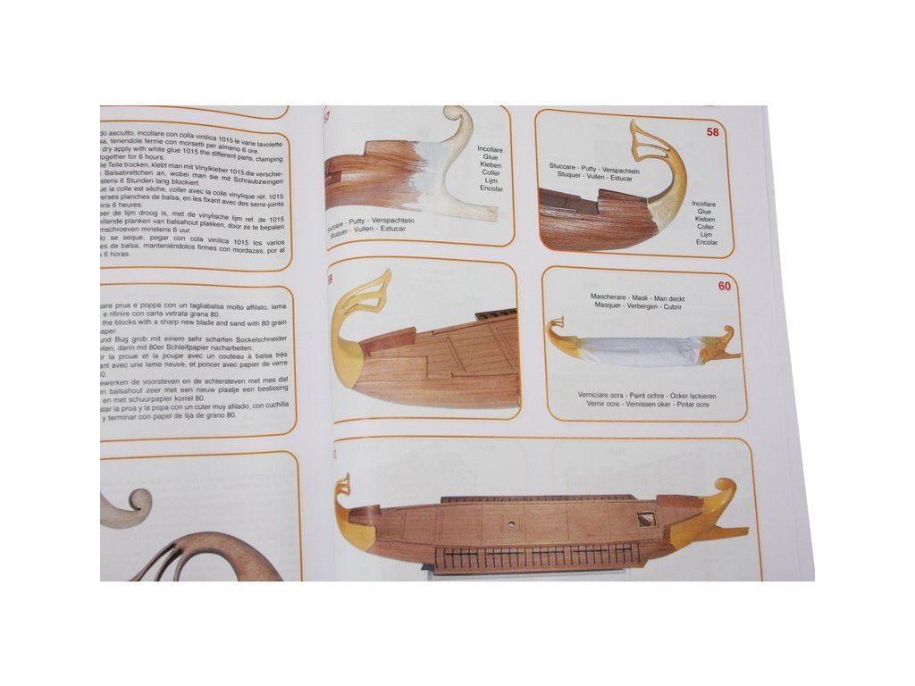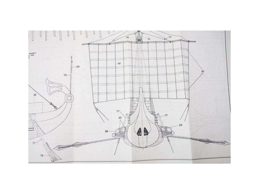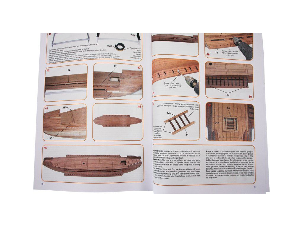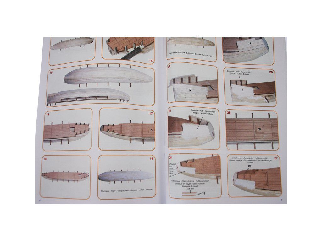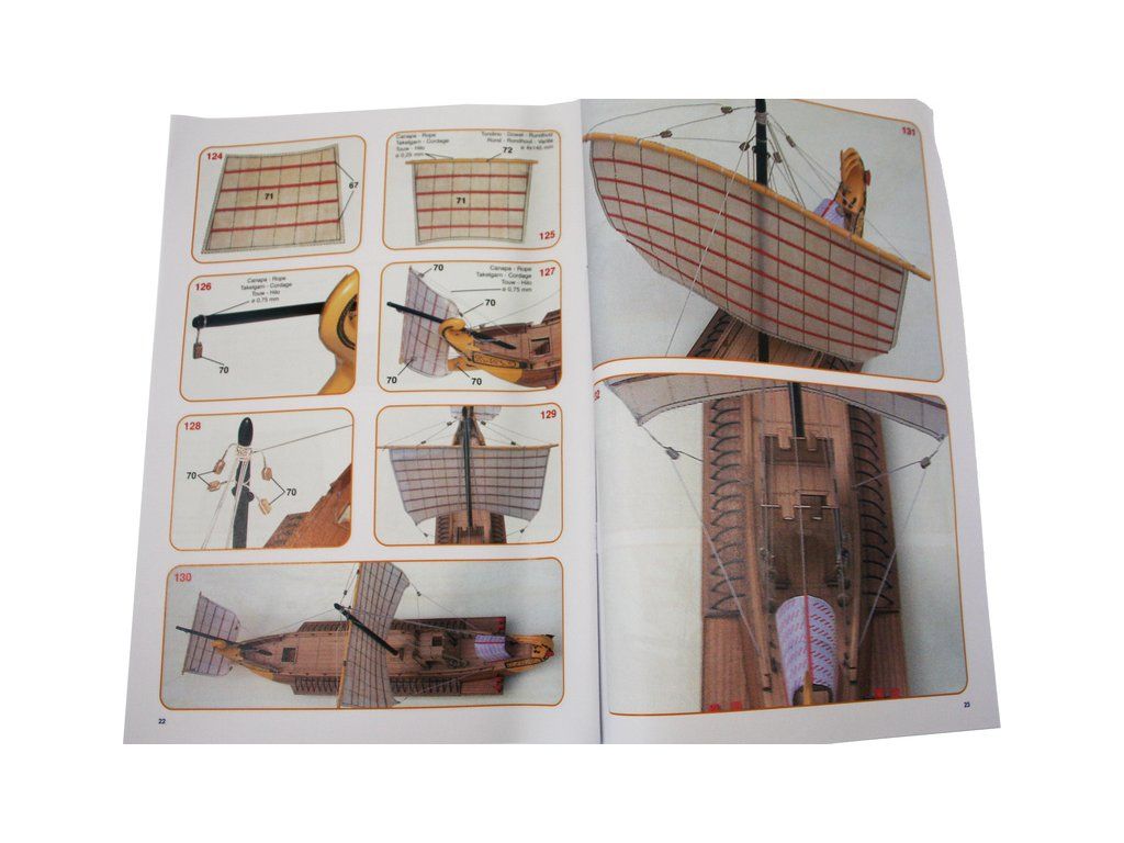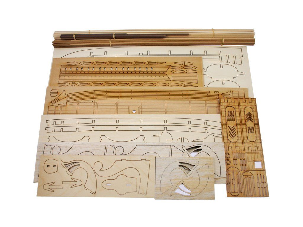 Balení obsahuje laserem řezané dřevěné díly, plaňky, palubu, stožáry, kovové a dřevěné kování, kovové odlitky, vlajku a plachtovinu. Stavební plány, podrobný obrázkový návod.