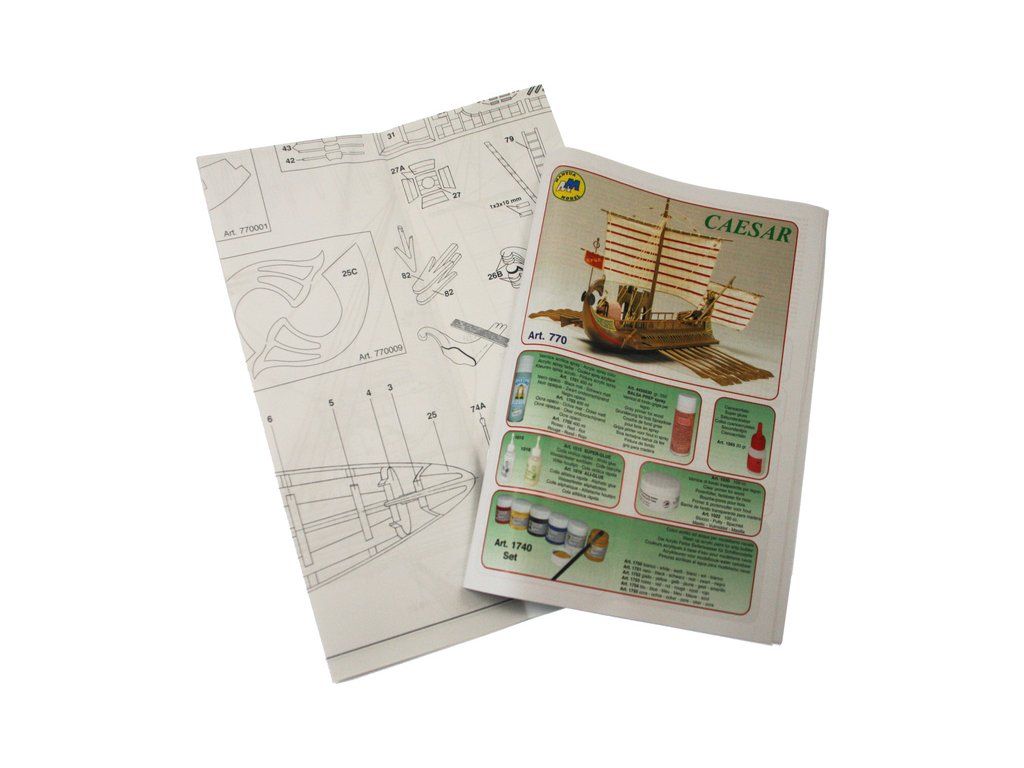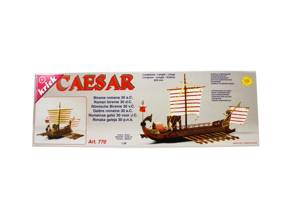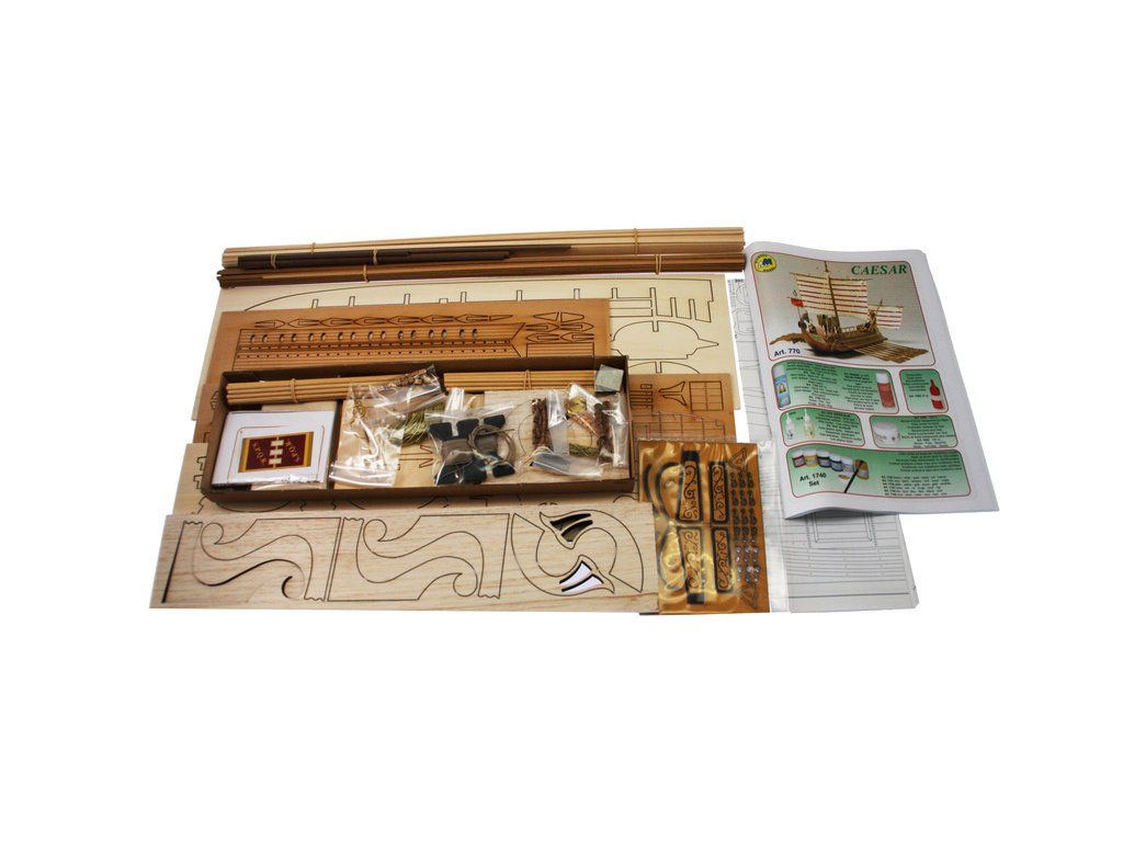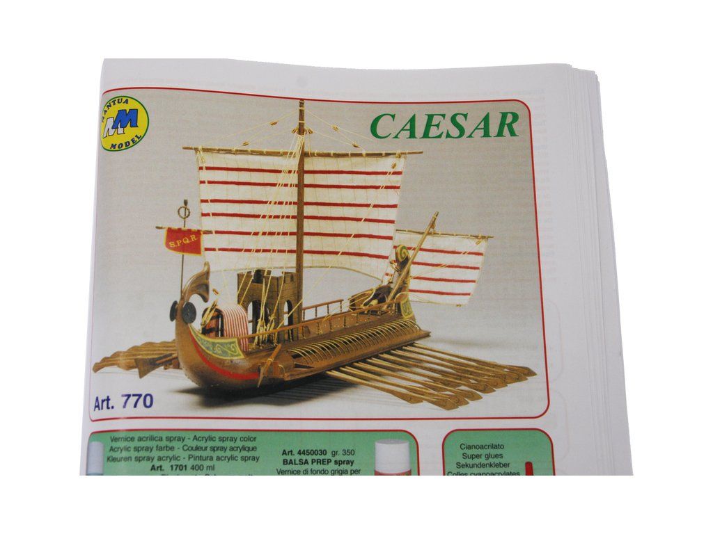 Stavebnice neplovoucího modelu lodi Mantua Model Caesar v měřítku 1:300 a délce 620 mm. Římská válečná loď z prvního století před naším letopočtem se dvěma řadami vesel. Kit obsahuje dřevěné díly, kovové odlitky dekorací a podrobné stavební plány.