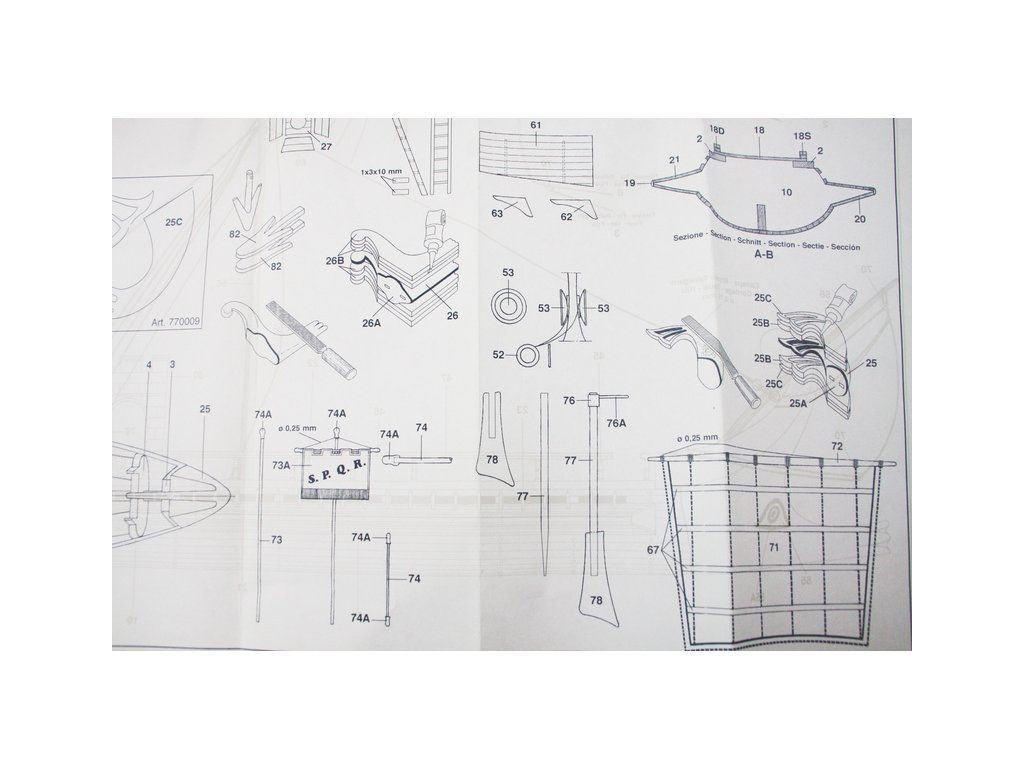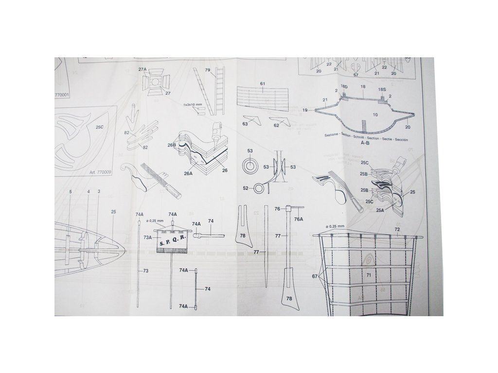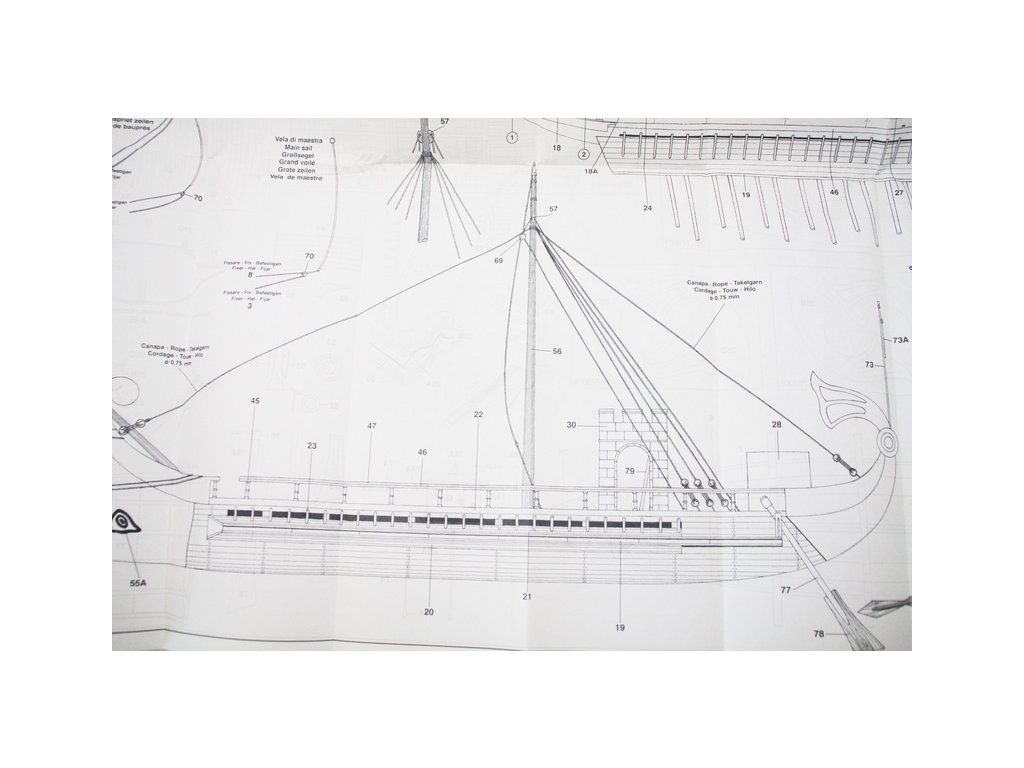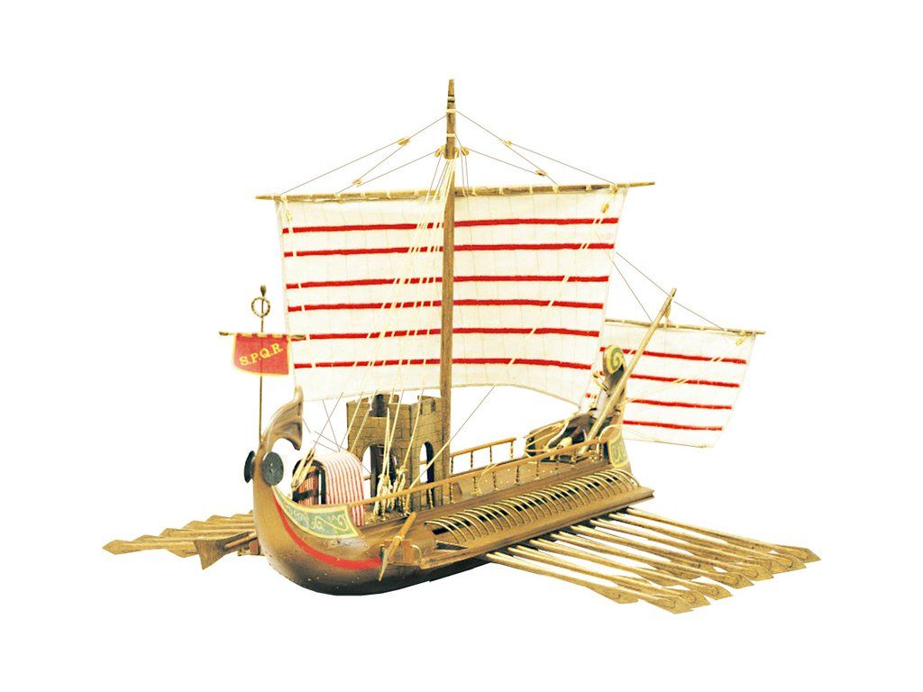 Stavebnice neplovoucího modelu lodi Mantua Model Caesar v měřítku 1:300 a délce 620 mm. Římská válečná loď z prvního století před naším letopočtem se dvěma řadami vesel. Kit obsahuje dřevěné díly, kovové odlitky dekorací a podrobné stavební plány.
