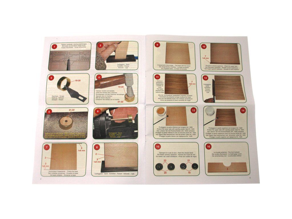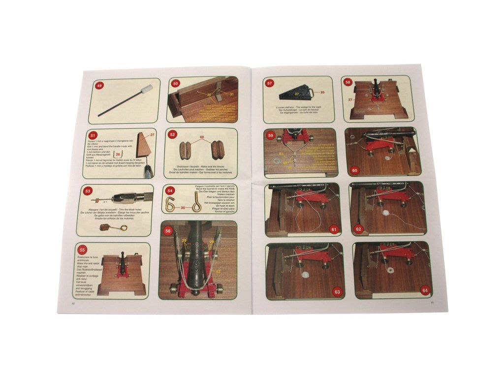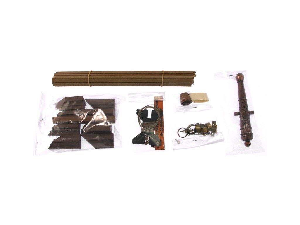 Balení obsahuje laserem vyřezávané dřevěné díly, kovové odlitky, hlaveň, lana, obrázkový vícejazyčný návod ke stavbě.