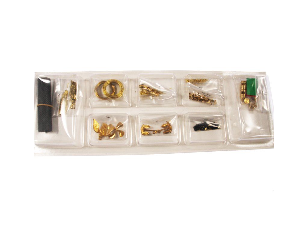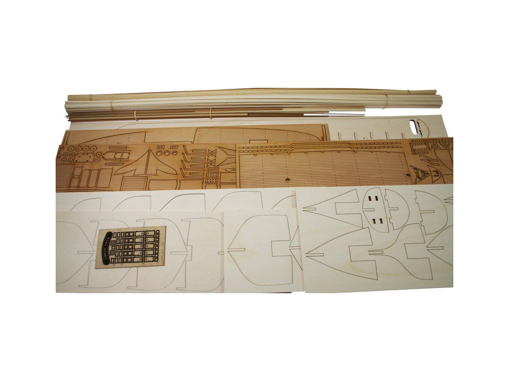 Balení obsahuje laserem řezané dřevěné díly, plaňky, paluby, stožáry, kovové a dřevěné kování, kovové odlitky a dekorace vyleptané z mosazi. Stavební plány, vícejazyčný návod.